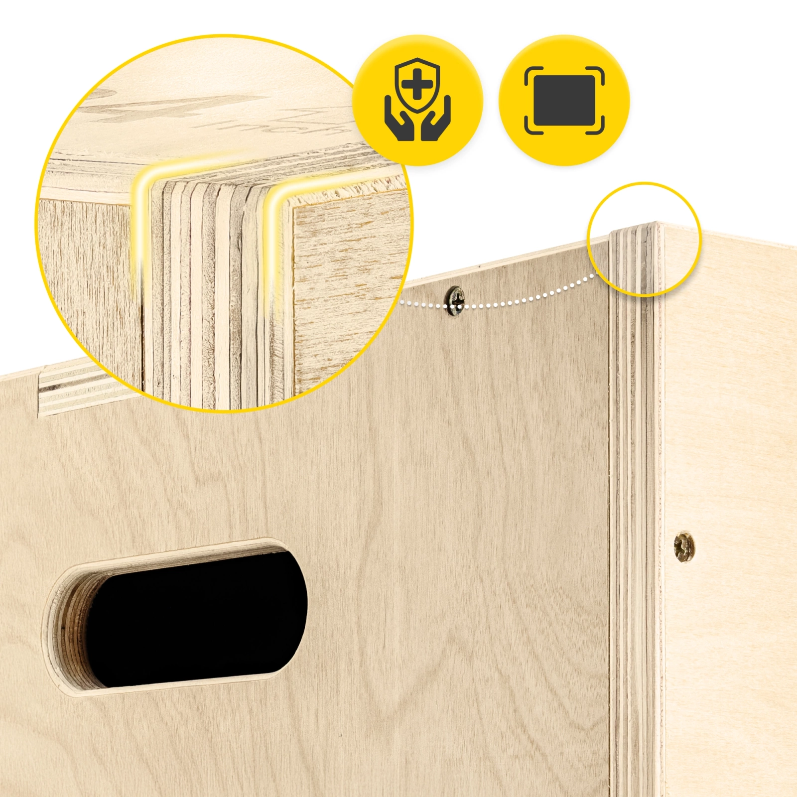 3️⃣ Sklejka o grubości 2 cm – skrzynia wykonana jest ze sklejki z drzew liściastych o grubości aż 2 cm, co  zapewnia skrzyni plyometrycznej wytrzymałość aż do 150 kg.