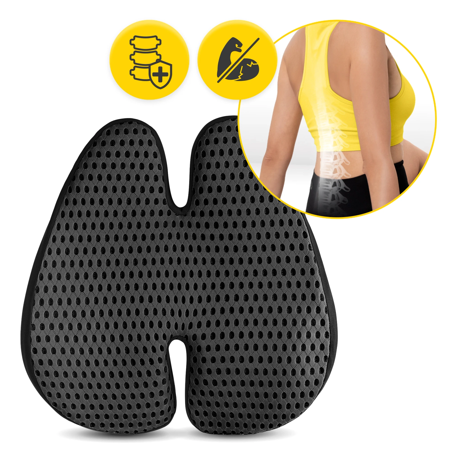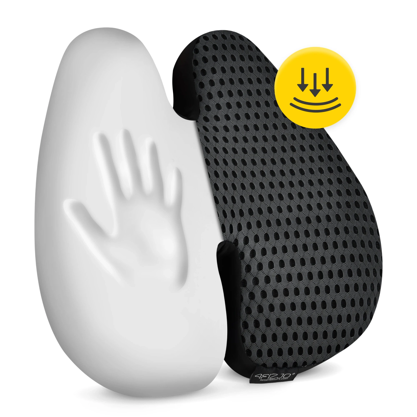 Poduszka do siedzenia na kręgosłup lędźwiowy ma ergonomiczny kształt. Idealnie dopasowuje się do kształtu pleców. Idealnie wypełnia zakrzywienie kręgosłupa w odcinku lędźwiowym, dając stabilne podparcie. Poduszka pozwala na utrzymanie prawidłowej postawy ciała, bez zbędnego wysiłku. Dzięki otwartej przestrzeni na kręgosłup odciąża plecy i zmniejsza ucisk. Poduszka może zmniejszyć napięcia, które są jedną z najczęstszych przyczyn bólów kręgosłupa, a w tym odcinka lędźwiowego.