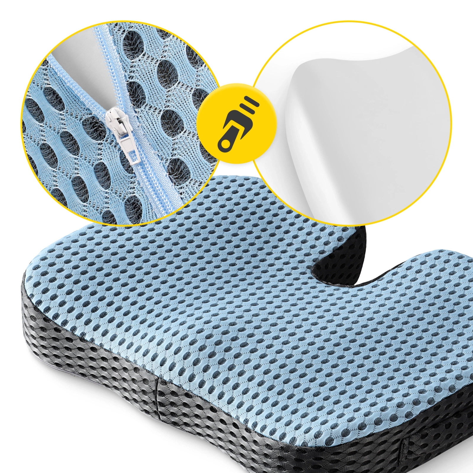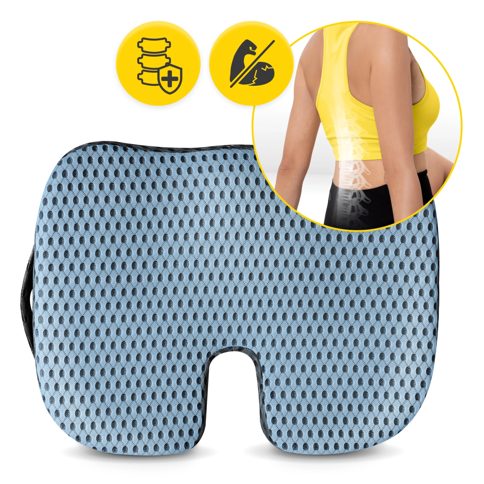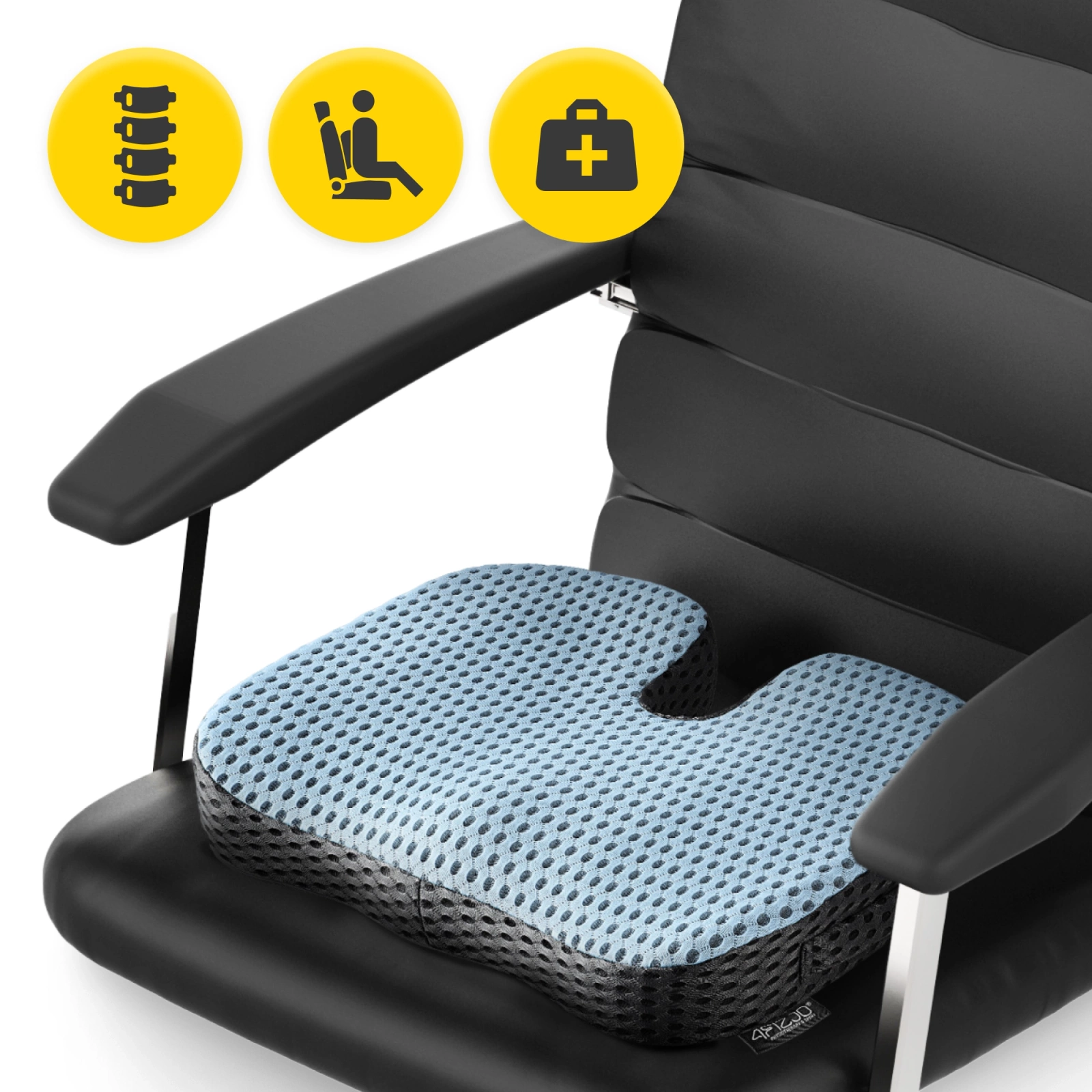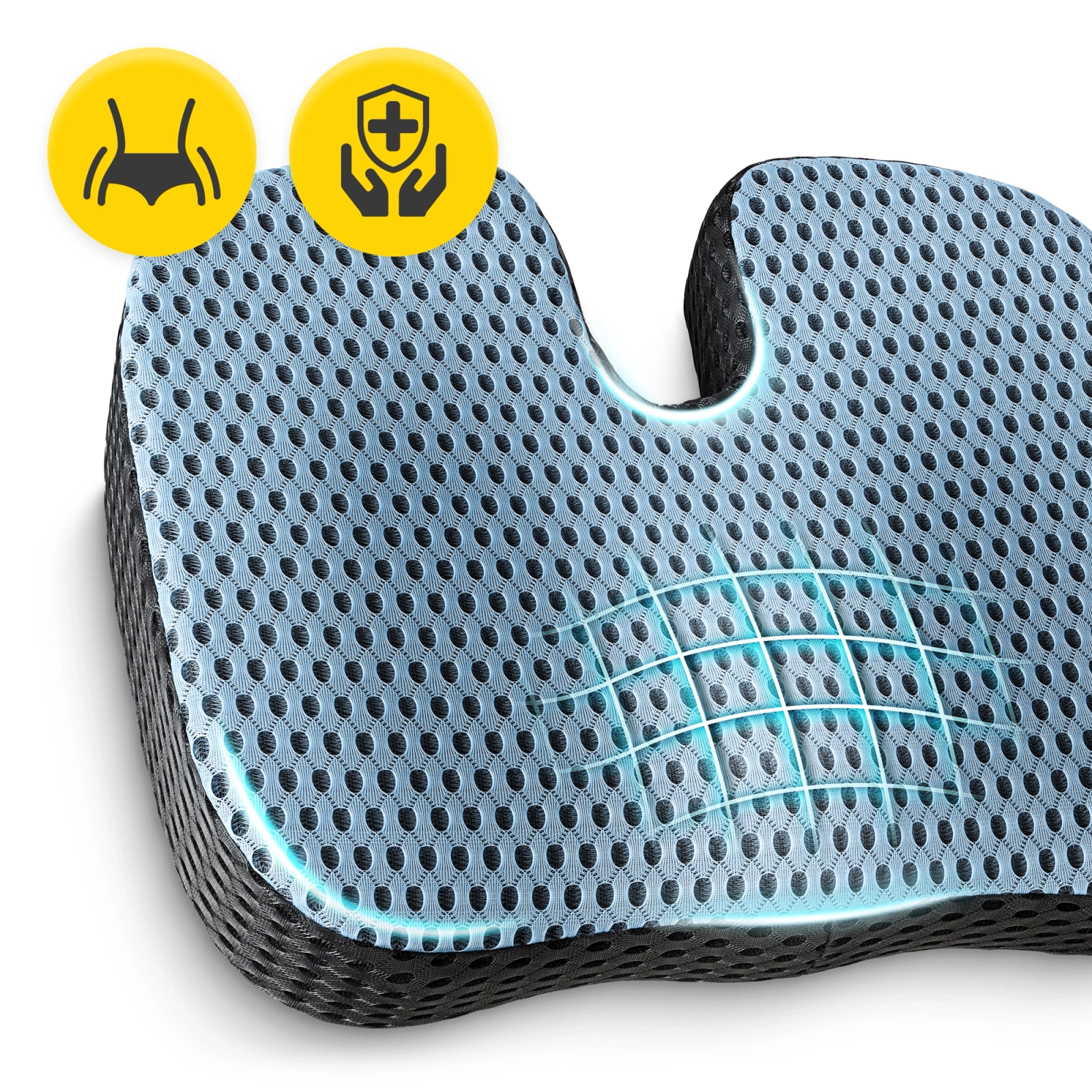 3️⃣ Niweluje punkty ucisku i rozprowadza ciężar równomiernie po całej powierzchni pośladków i ud. To przynosi ulgę, zmniejsza obciążenie kręgosłupa i zapobiega bólom odcinka lędźwiowego.