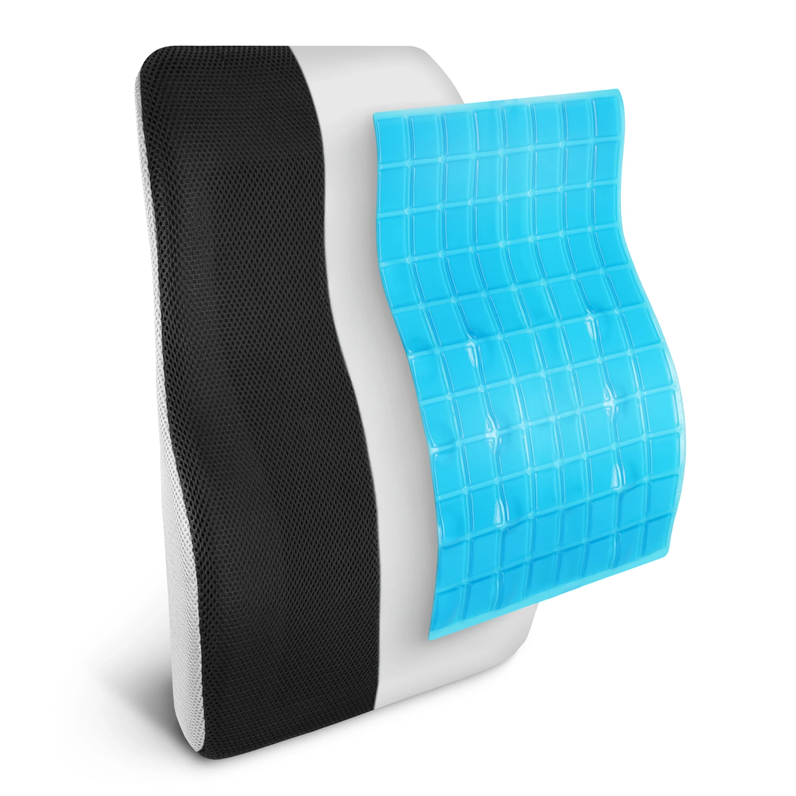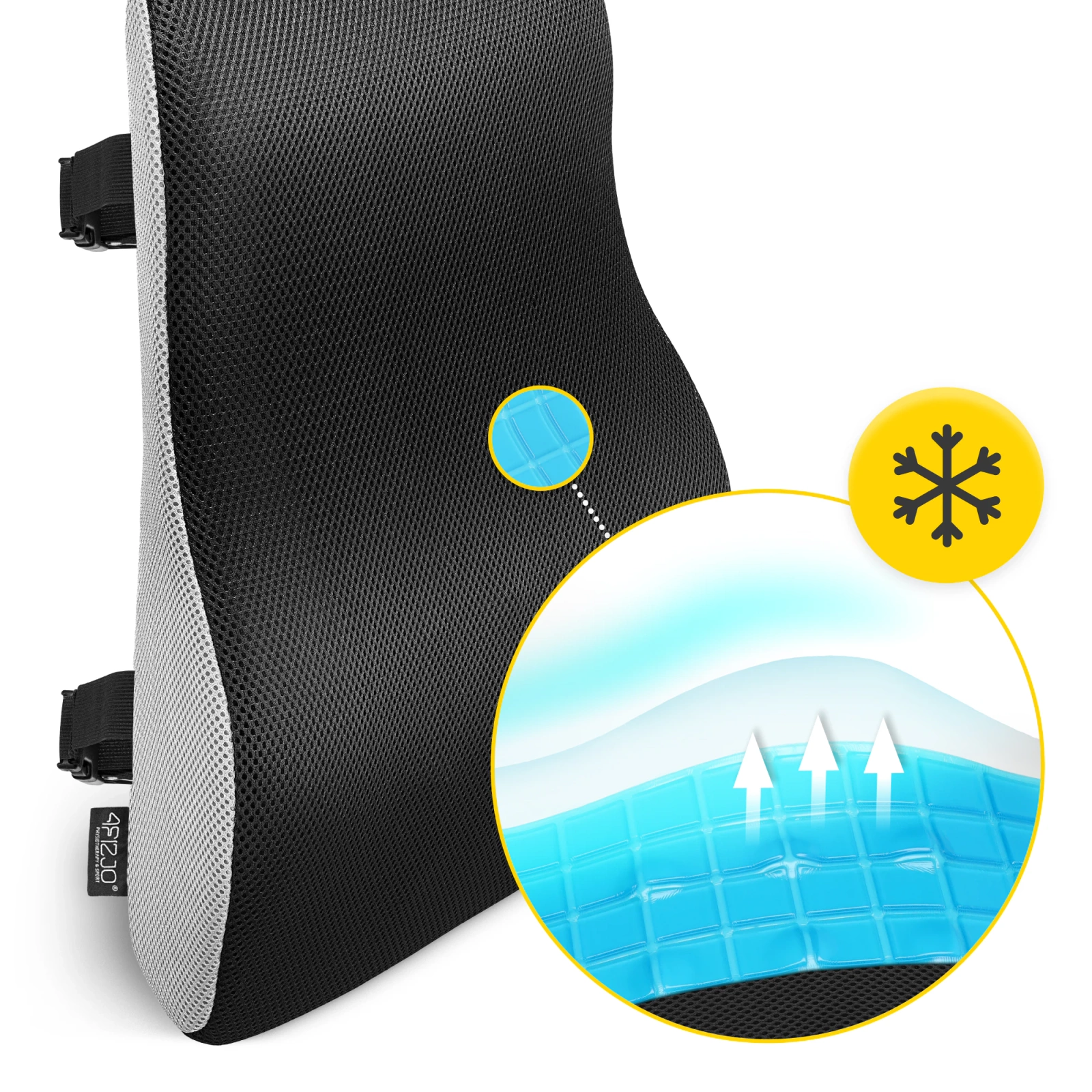 Chłodząca poduszka ortopedyczna pod plecy 4FIZJO to produkt, który został wzbogacony o wkładkę żelową chłodzącą. Może poprawić to komfort i jakość podróży lub pracy. Wkładka żelowa działa kojąco, dzięki czemu wspiera utrzymanie optymalnej temperatury ciała. Żelowa wkładka pozwala na złagodzenie bólu nawet po długim czasie siedzenia.