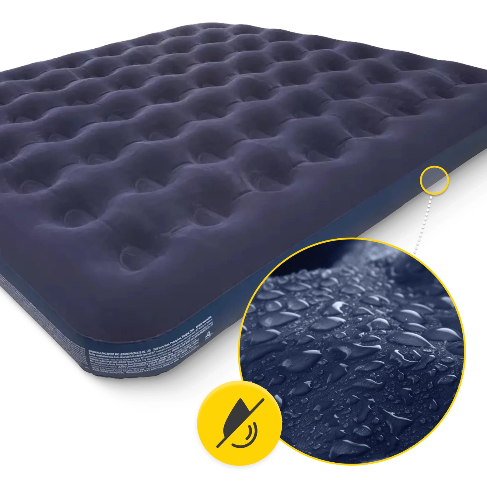 Dwuosobowy materac dmuchany do spania został wykonany z trwałych materiałów. Dobrze izolują od podłoża i zapewniają ochronę przed uszkodzeniami mechanicznymi. Przemyślany podział na sekcje zapewnia niesamowitą miękkość i komfort, spełniając oczekiwania wymagających użytkowników. Zaokrąglone brzegi zwiększają wygodę podczas leżenia, a jego elastyczna struktura doskonale dopasowuje się do kształtu ciała. Materac jest odporny na wilgoć, co czyni go idealnym wyborem na każdą podróż. Co więcej, miękka, welurowa powierzchnia materaca dmuchanego i dołączone do zestawu 2 poduszki zapewnią przyjemny, relaksujący odpoczynek.