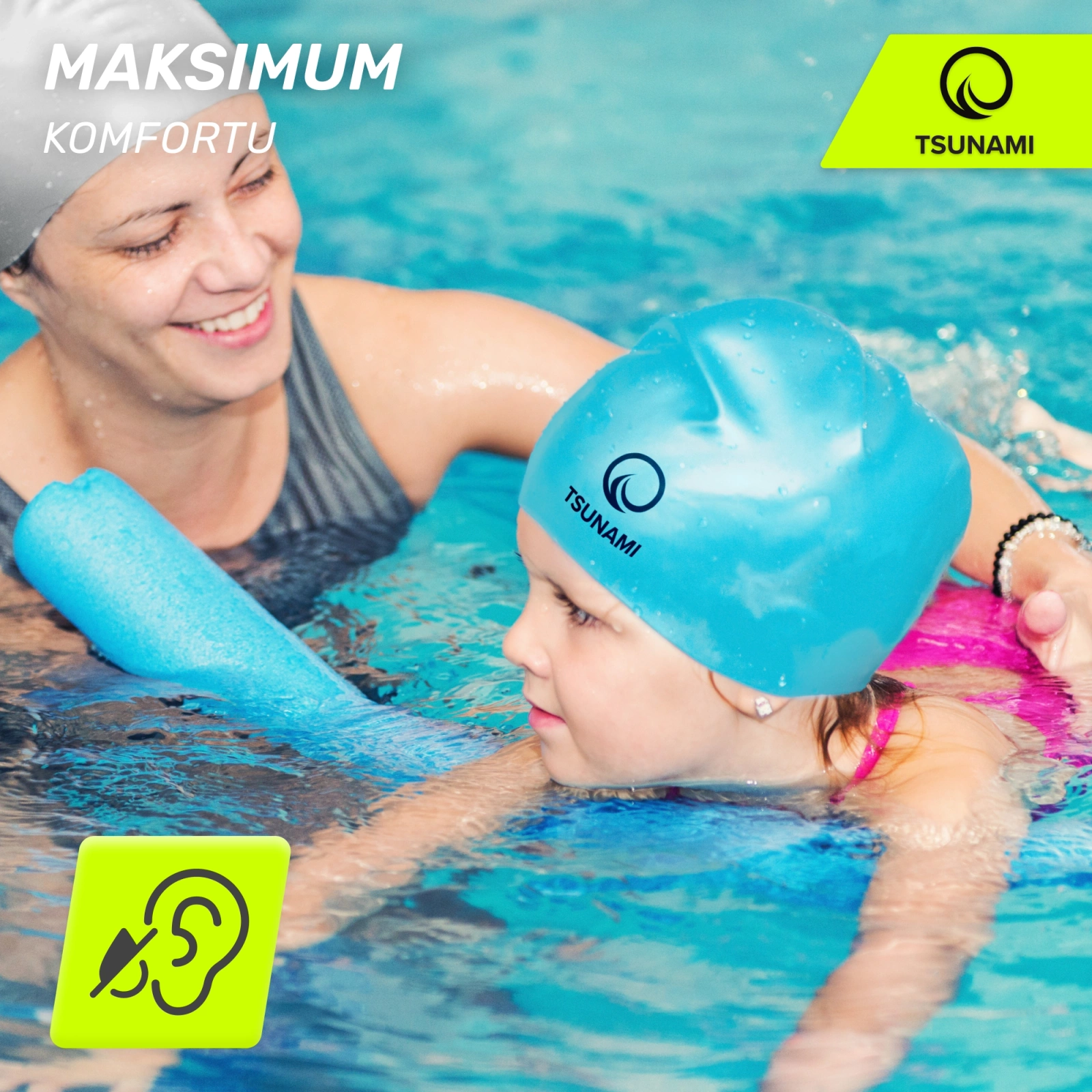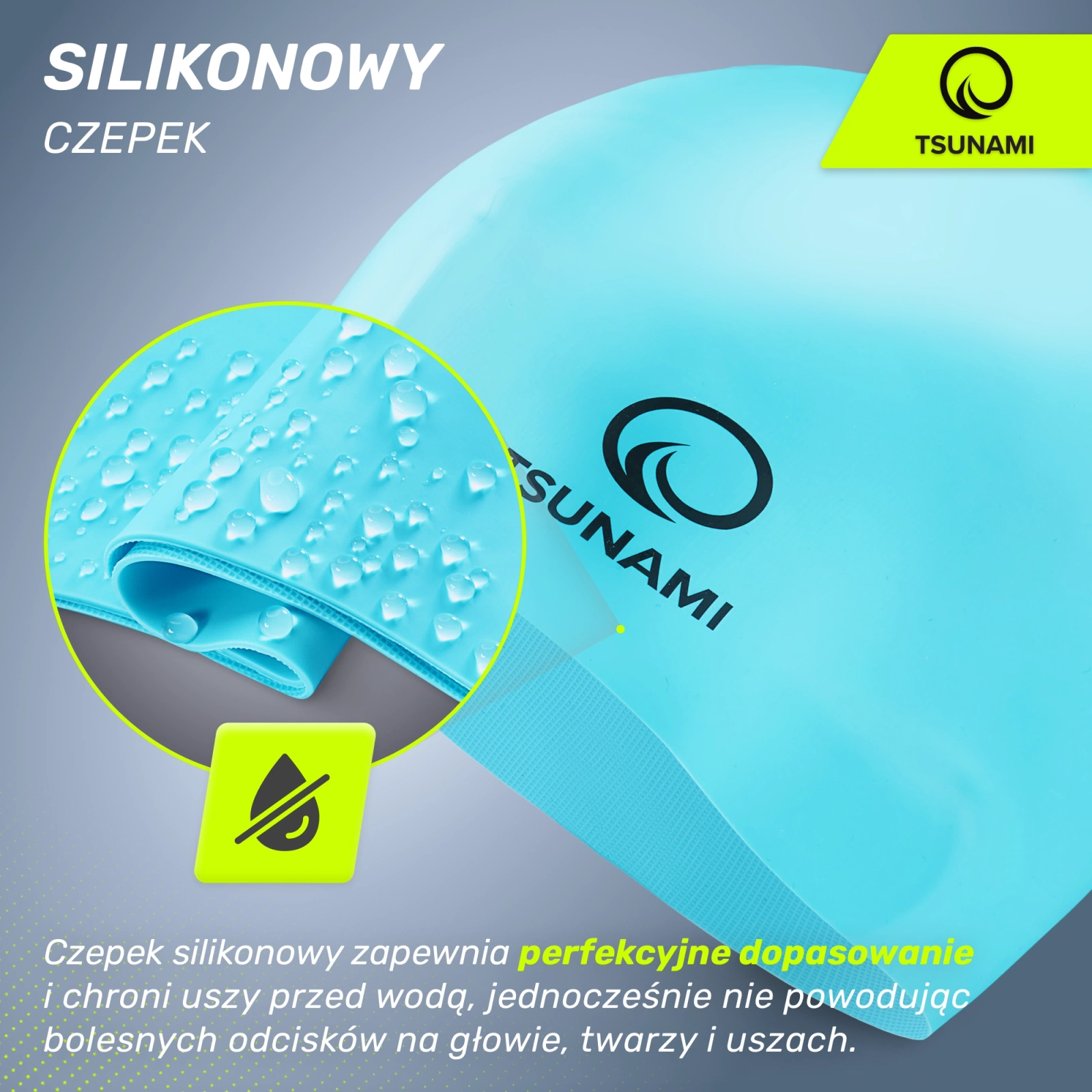 ✅ Czepek silikonowy zapewnia perfekcyjne dopasowanie i chroni uszy przed wodą, jednocześnie nie powodując bolesnych odcisków na głowie, twarzy i uszach.