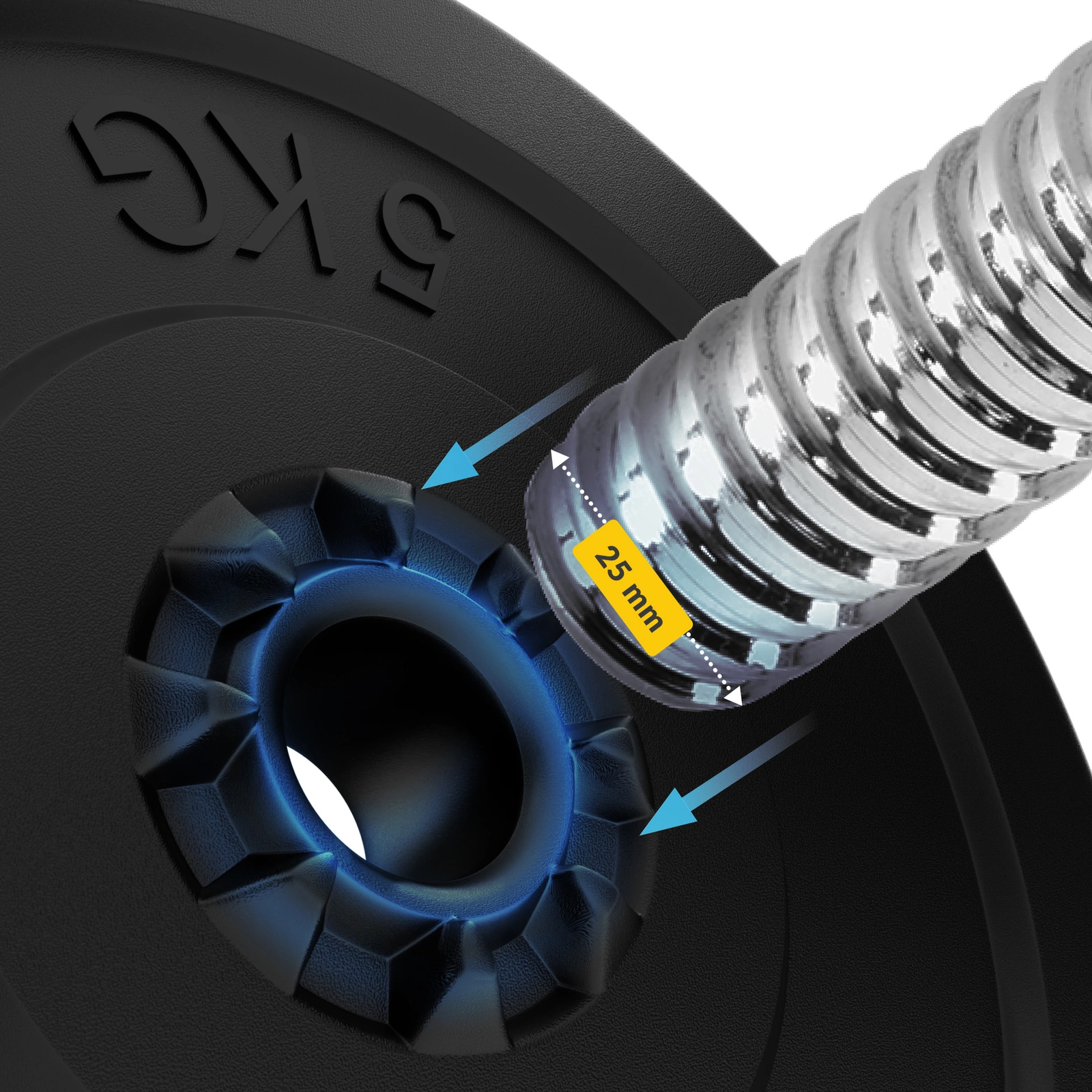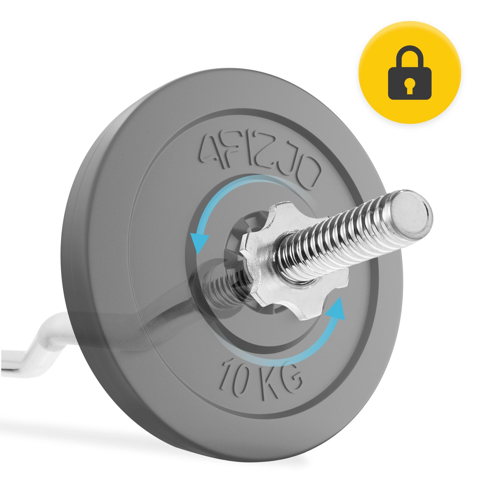 Stabilność obciążenia, a co za tym bezpieczeństwo to priorytety podczas ćwiczeń siłowych. Dlatego też zaletą są gwintowane zakończenia, na których mocuje się talerze. Dzięki temu nie zsuwają się i nie kołyszą w trakcie intensywnych ćwiczeń. Pożądany efekt zapewniają dołączone do gryfu dodatkowe 2 zaciski z gumowymi uszczelkami.