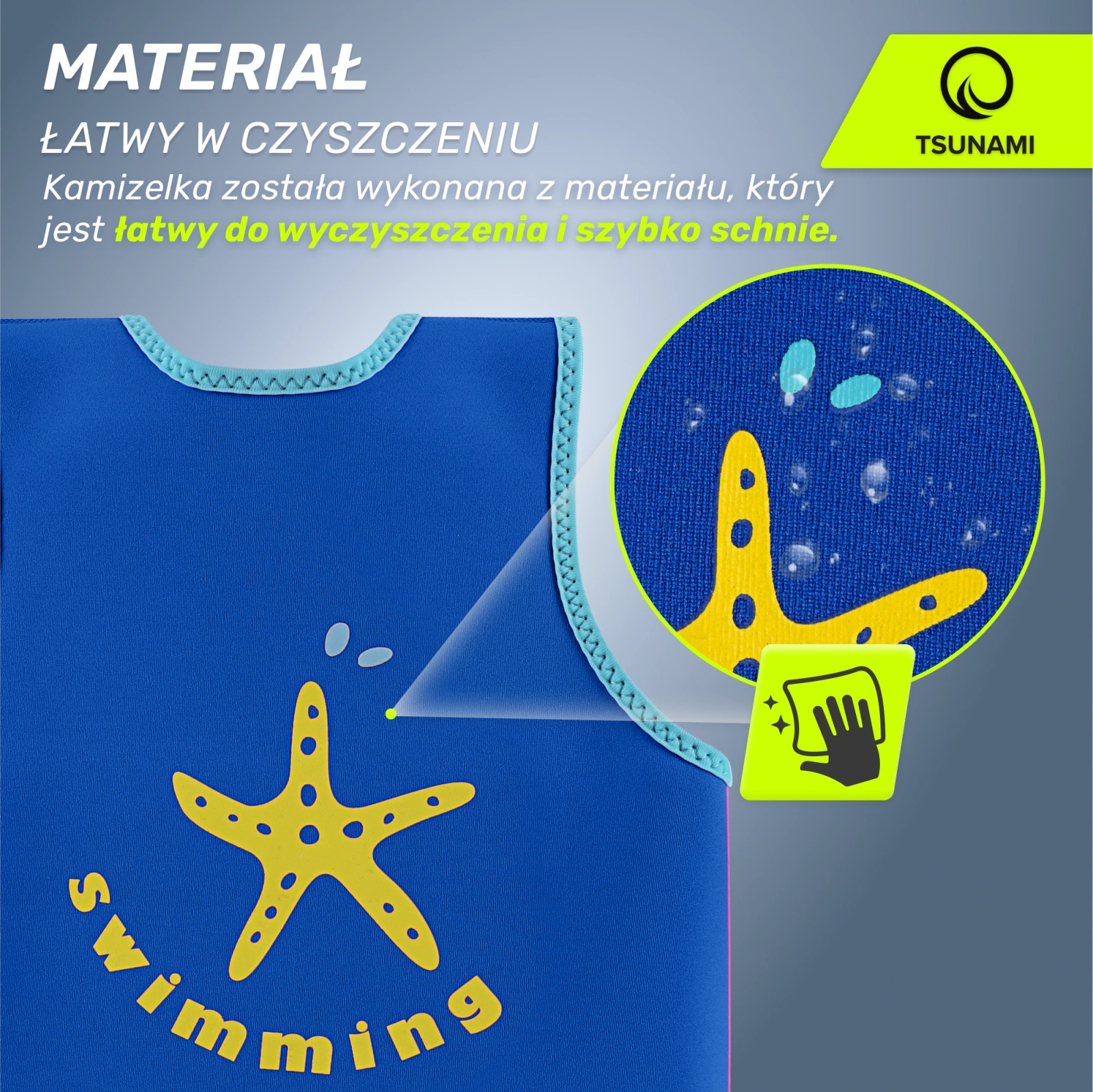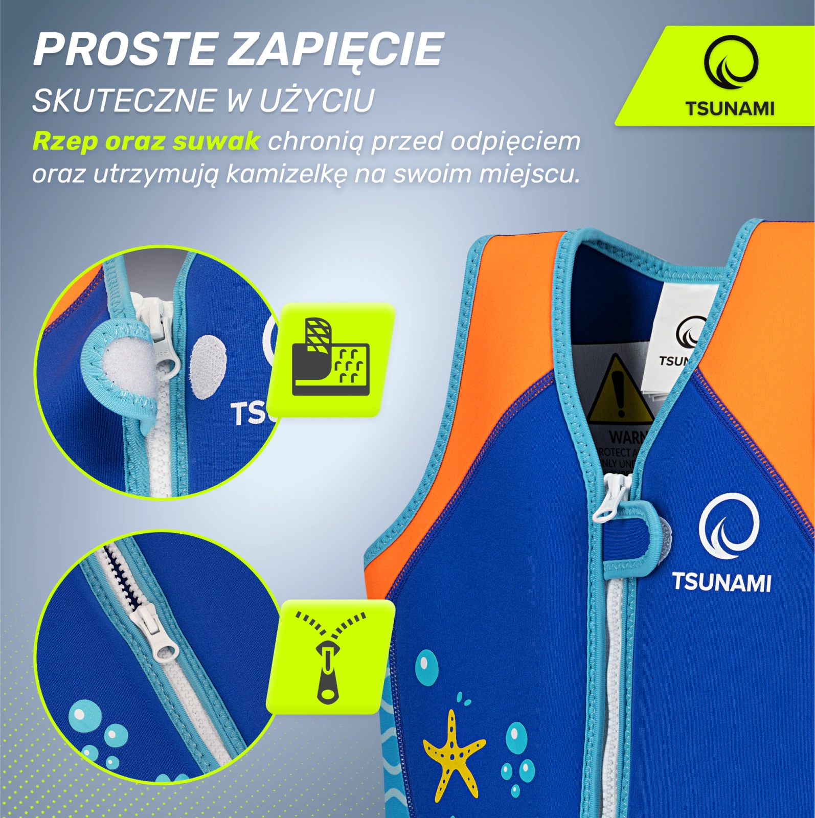 Kamizelka wypornościowa dla dzieci sprawdzi się w ogrodowym basenie, podczas zabawy nad jeziorem czy na wakacjach nad morzem – kamizelka TSUNAMI pomoże dziecku czuć się pewnie i bezpiecznie w wodzie.
