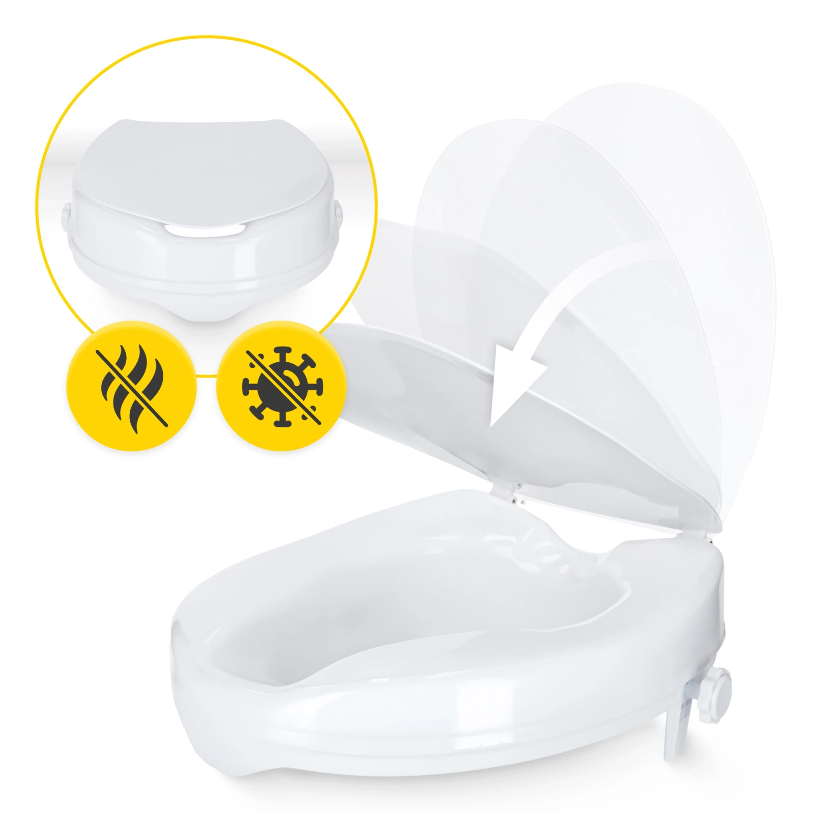 Dostępne w trzech wysokościach podwyższenia – co pozwala dobrać wersję najlepiej dopasowaną do potrzeb i poziomu sprawności. Ergonomiczny kształt siedziska oraz dwa strategiczne wycięcia (z przodu i z tyłu) ułatwiają wykonywanie czynności higienicznych bez konieczności przyjmowania niewygodnej pozycji.