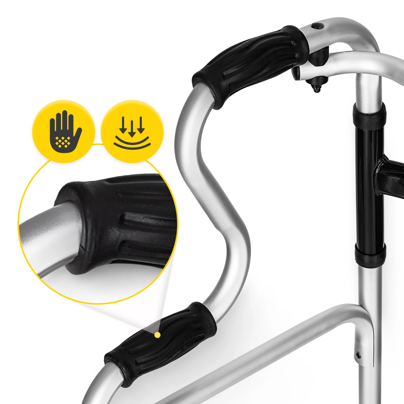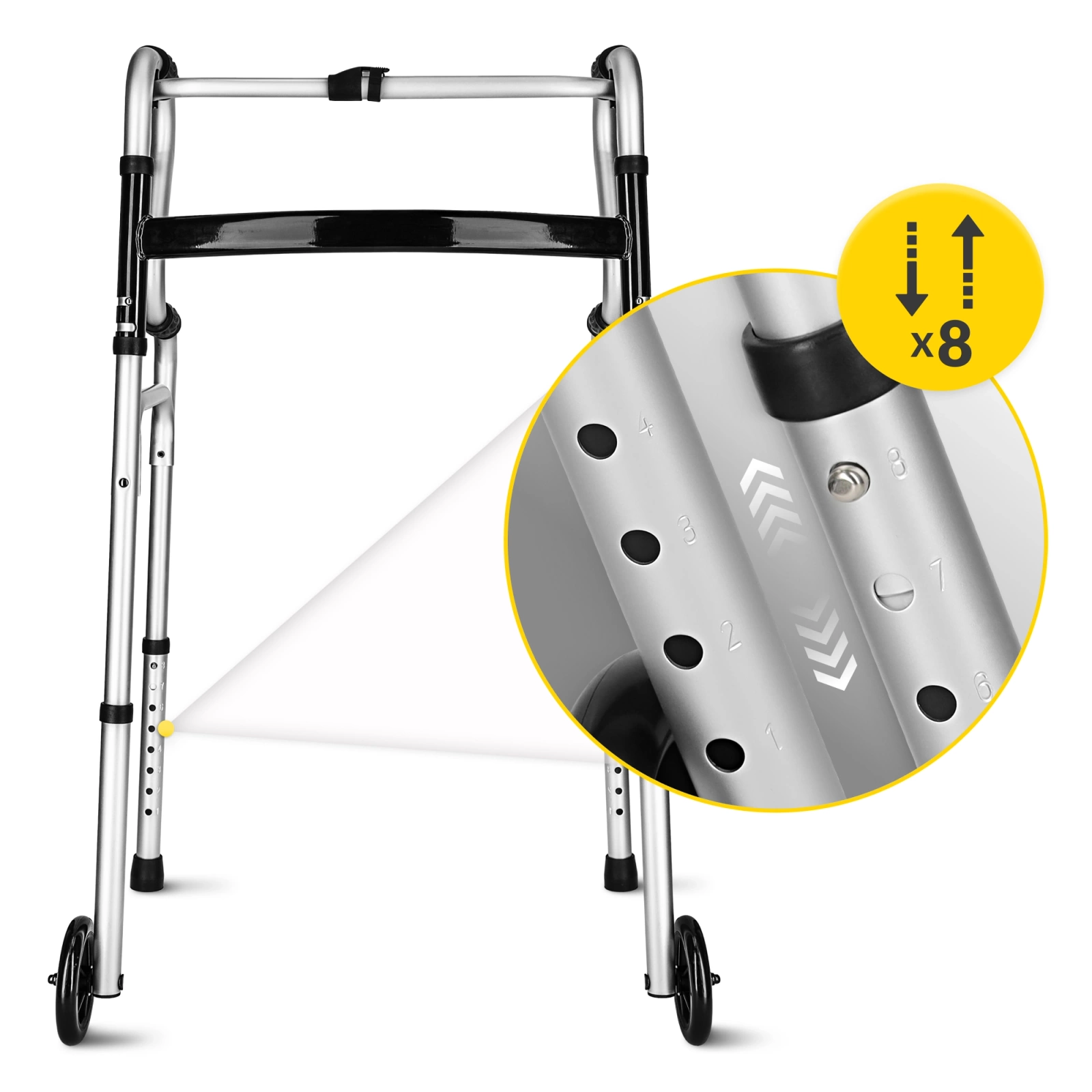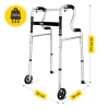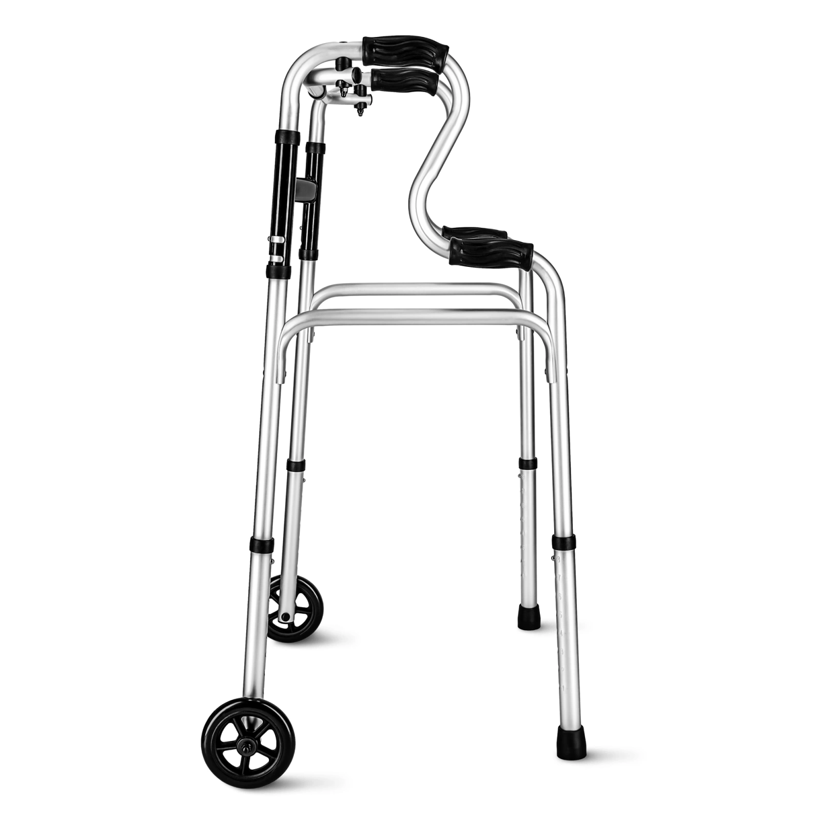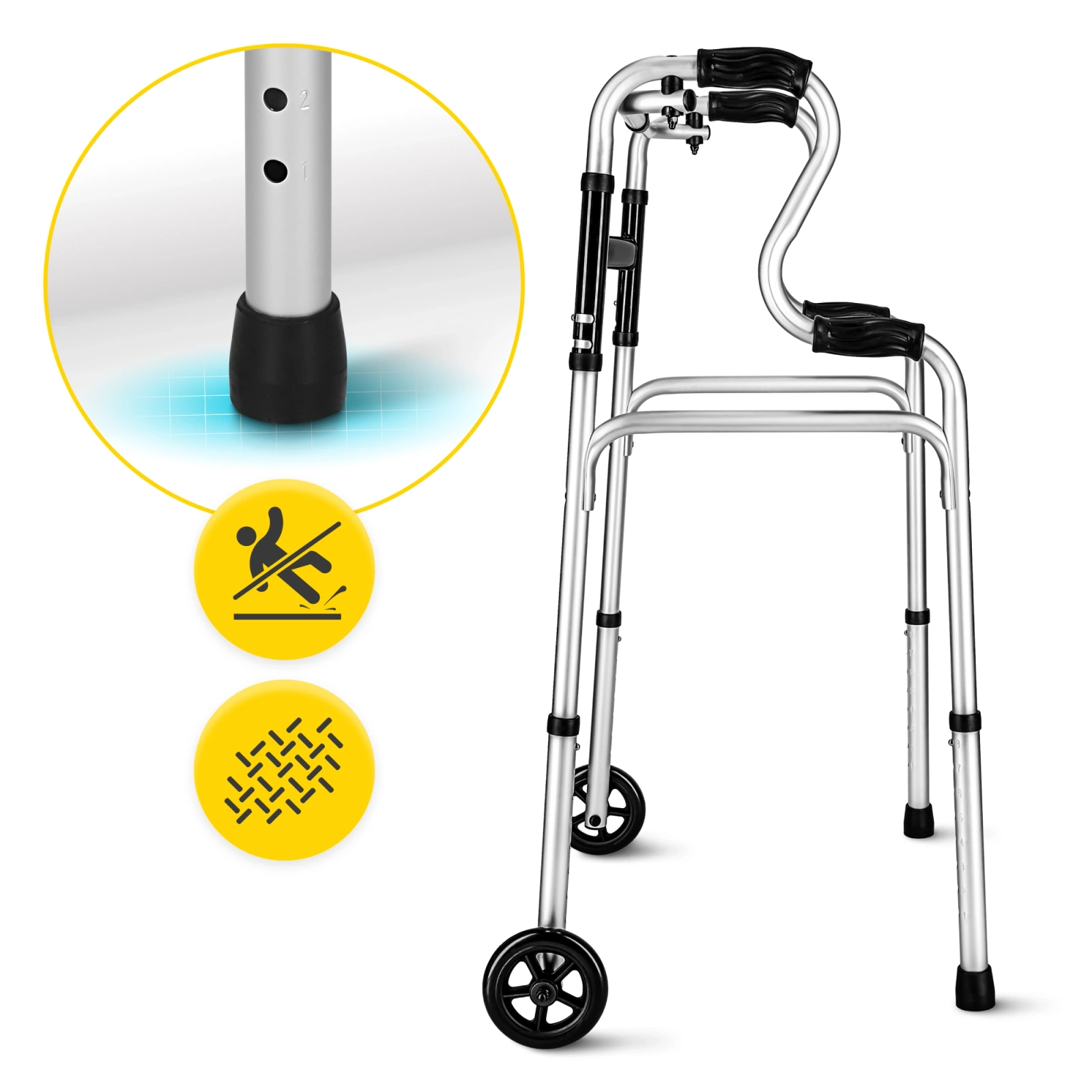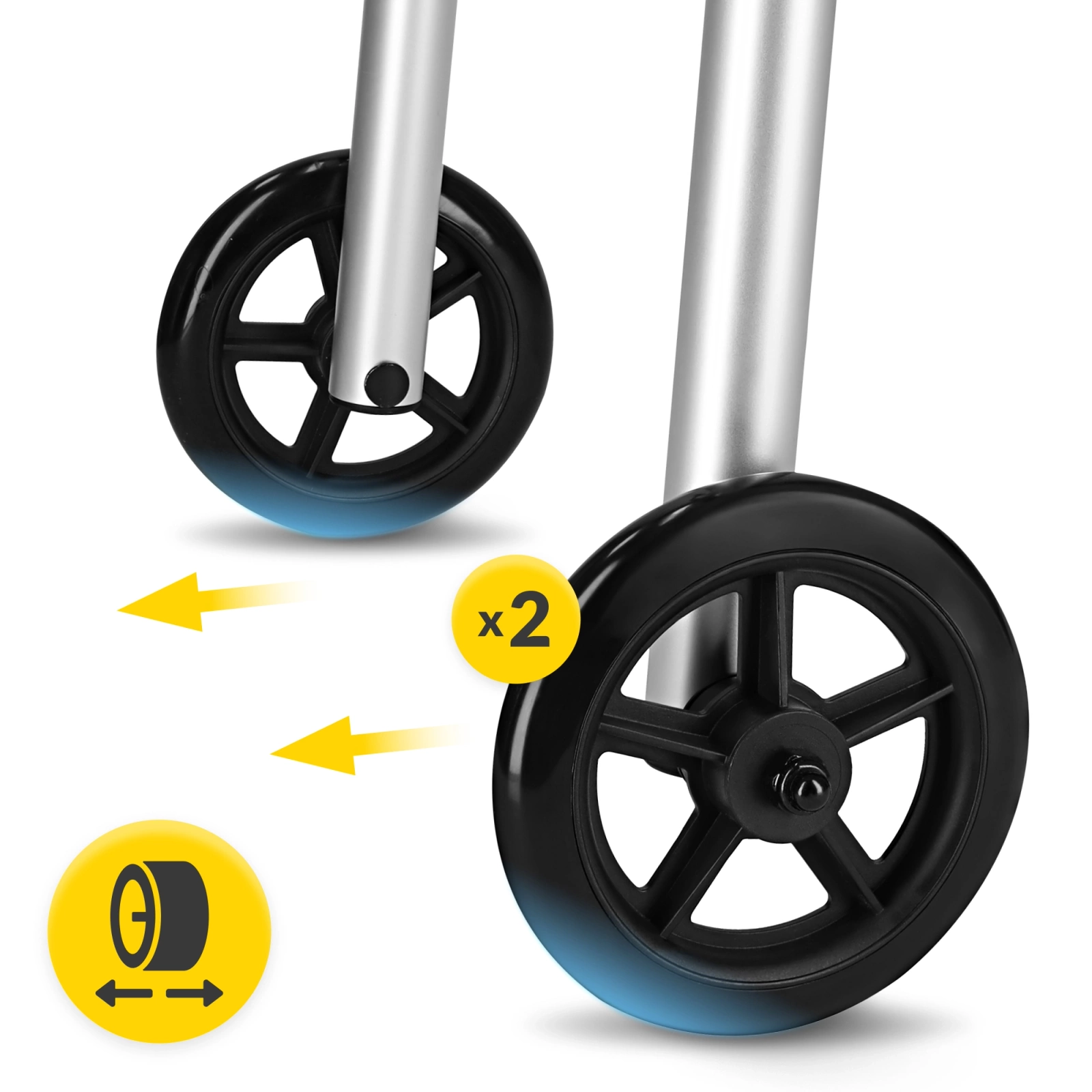 Ten nowoczesny balkonik łączy dwie funkcje w jednym urządzeniu – użytkownik może łatwo przełączyć się między trybem stałym a kroczącym, dostosowując sprzęt do swoich możliwości i potrzeb rehabilitacyjnych. Przód wyposażono w kółka o średnicy 5” (12 cm), które ułatwiają poruszanie się, a tył zakończono gumowymi nasadkami dla maksymalnej przyczepności i kontroli na gładkim podłożu.
