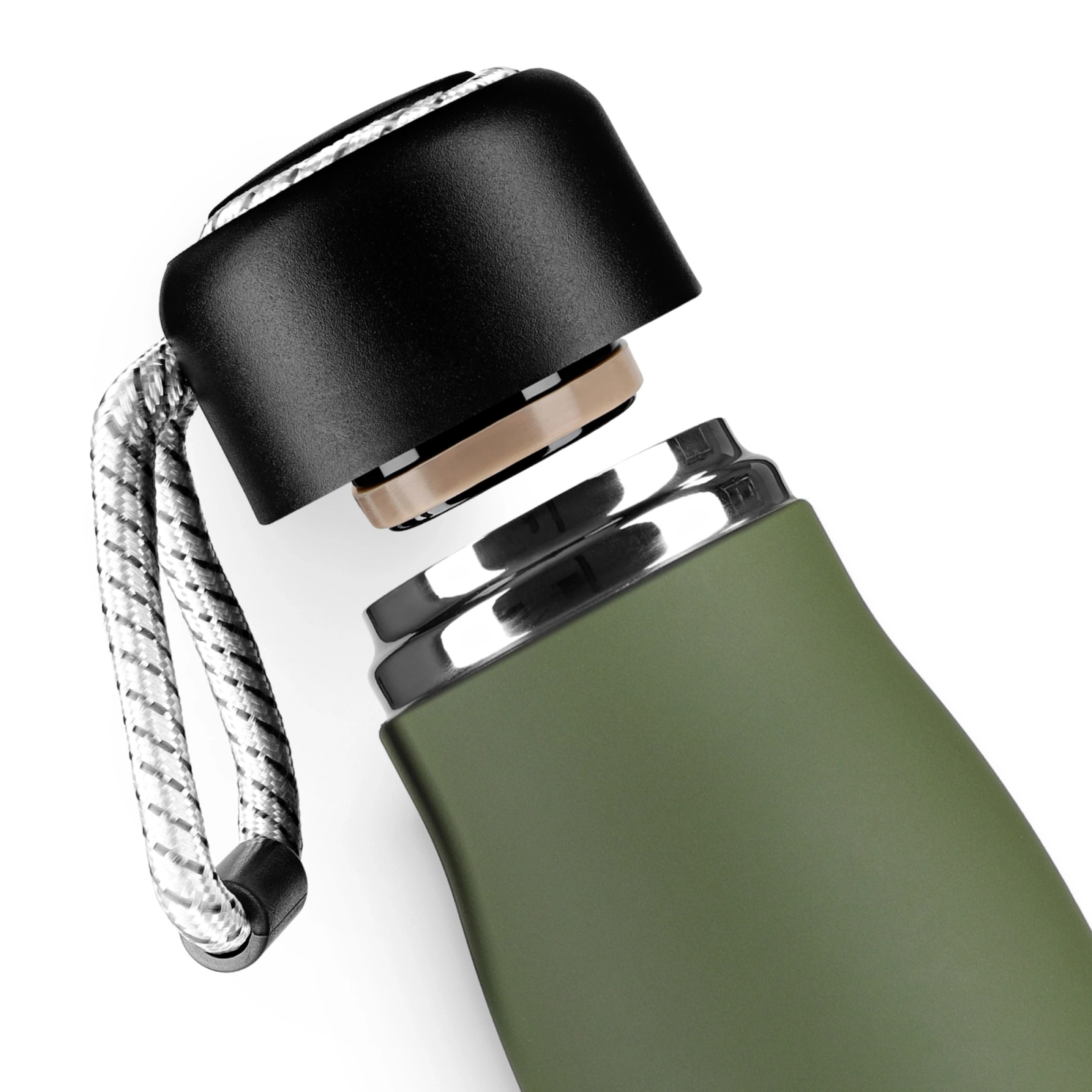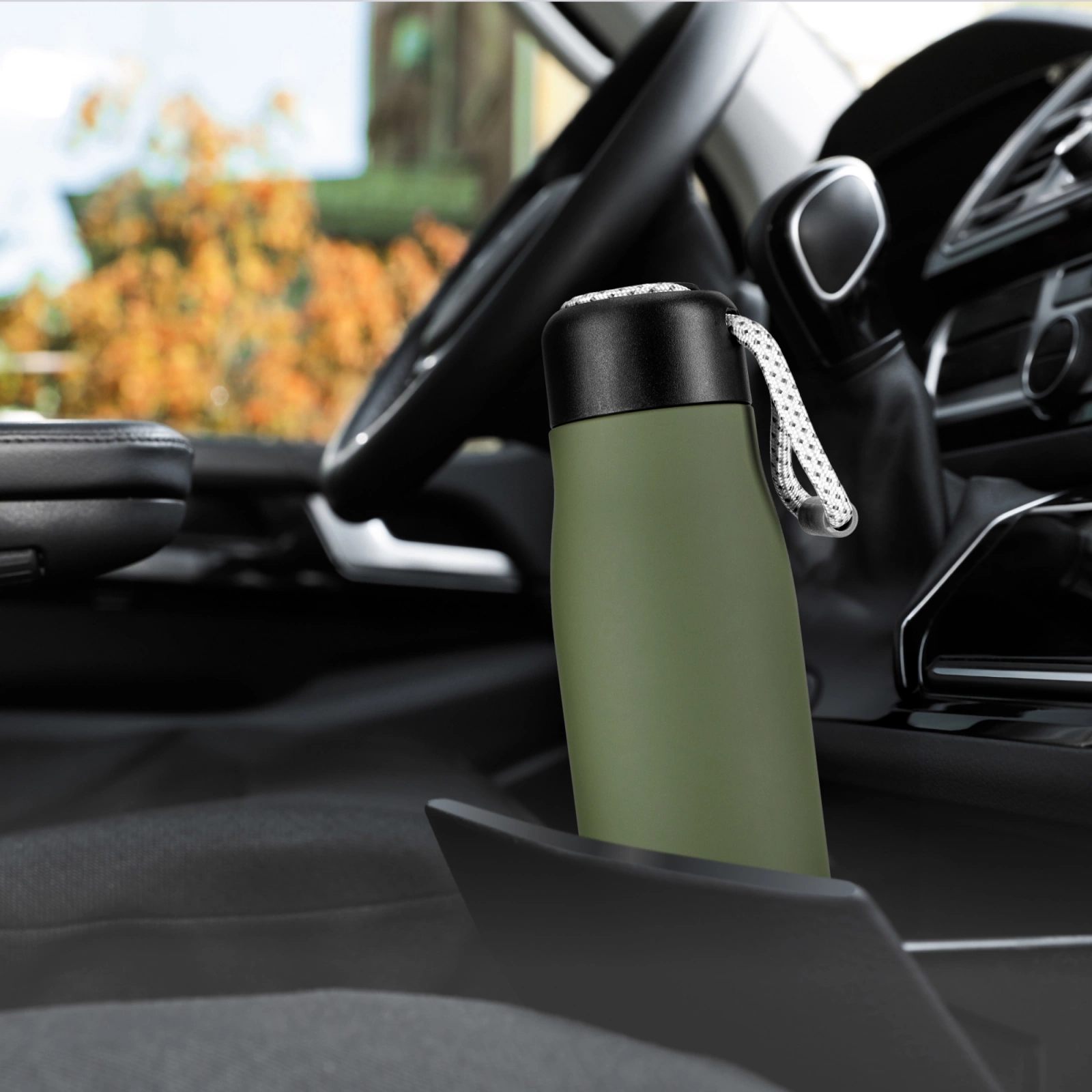 Dzięki minimalistycznemu designowi i kompaktowym wymiarom butelka zmieści się w torbie sportowej, plecaku, a nawet większej torebce. Antypoślizgowa powłoka zewnętrzna zapewnia pewny chwyt, a mocny sznurek ułatwia przenoszenie i przypięcie do plecaka. Zabierz ją do biura, na trening, wycieczkę górską lub po prostu – korzystaj na co dzień.