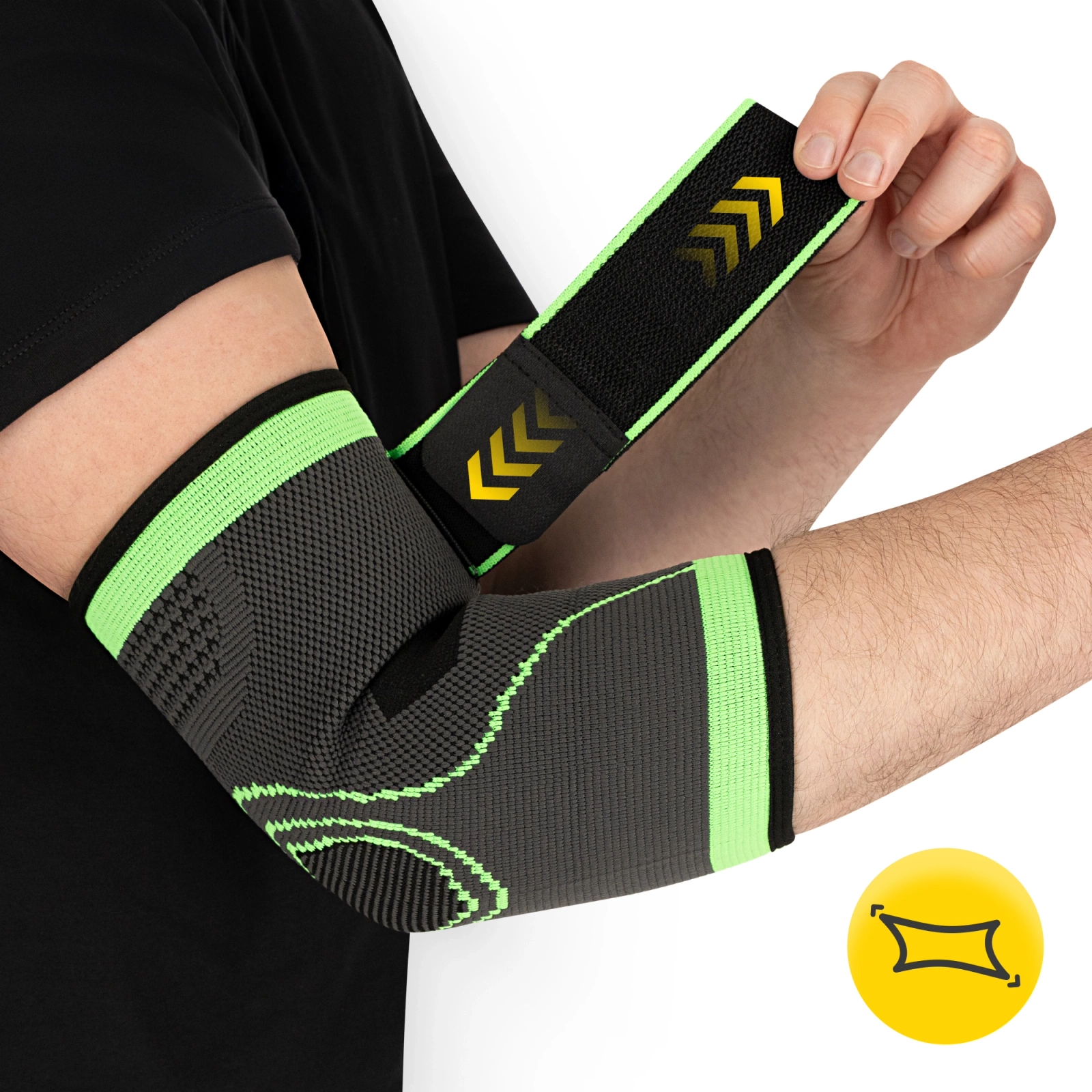 ➡️Praktyczny pasek z rzepem – chcąc odpowiednio zacisnąć opaskę na łokieć, skorzystasz z rozciągliwego paska zapinanego na mocny rzep.