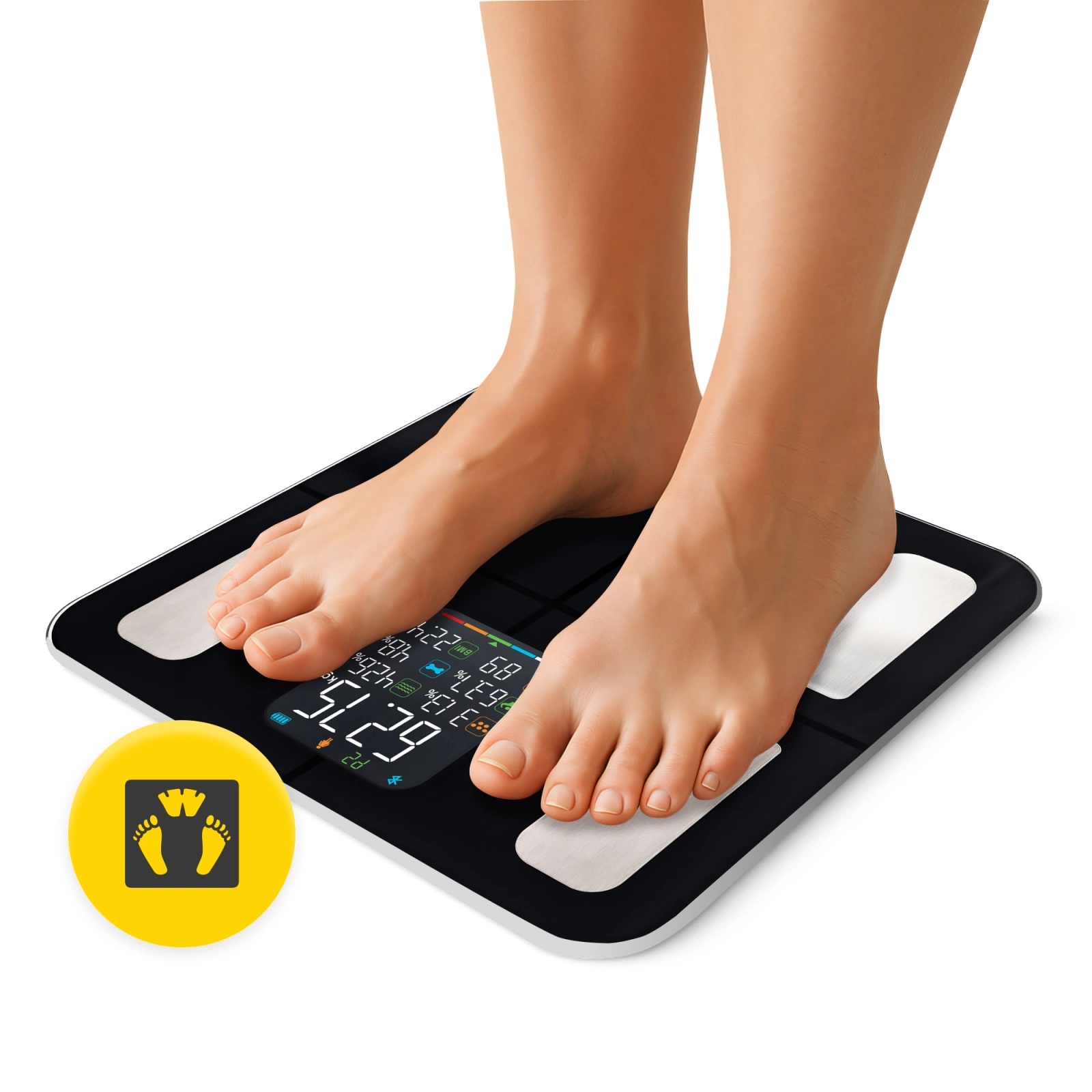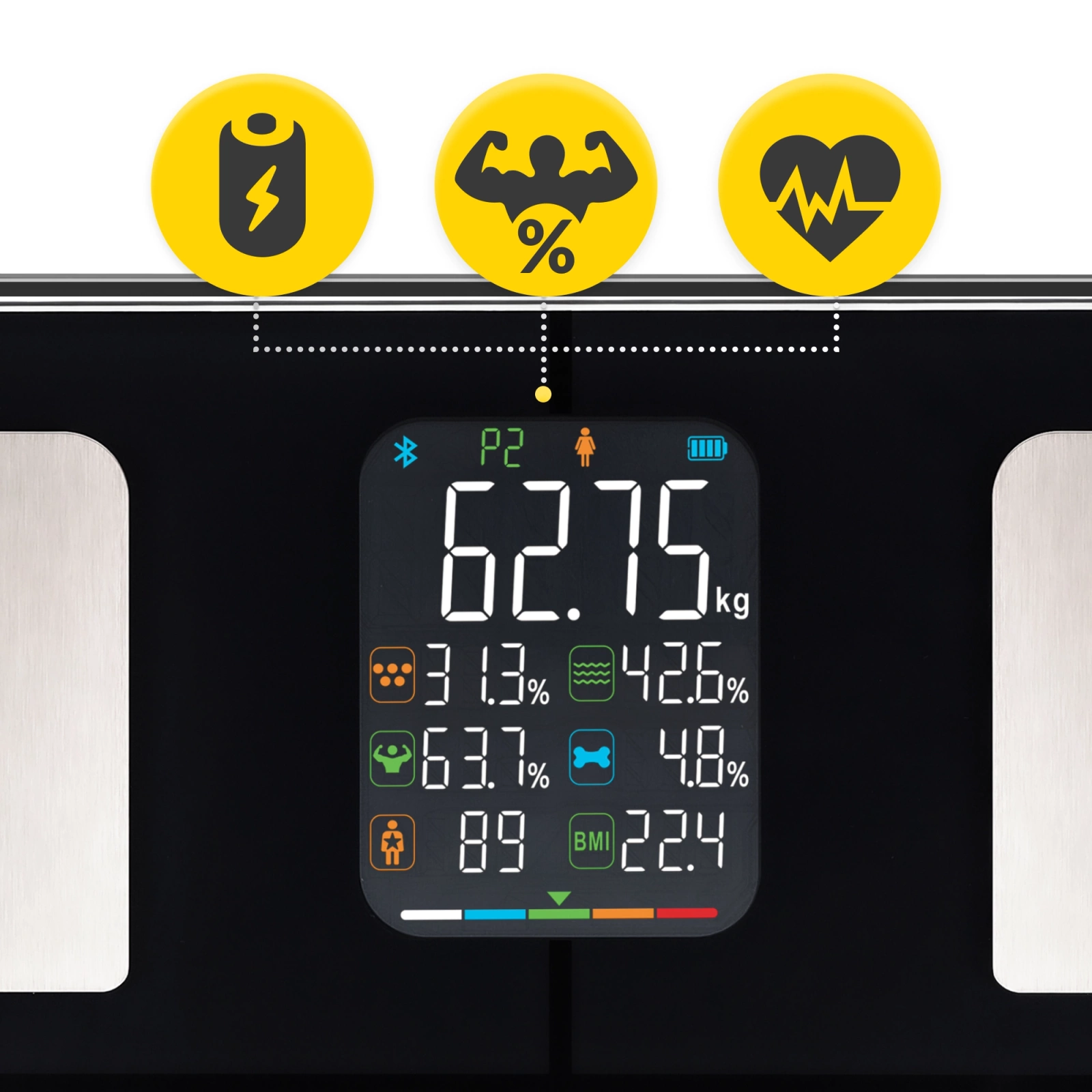 ✔️ Funkcje pomiarowe: masa ciała, BMI, % tkanki tłuszczowej, % wody, masa mięśniowa, masa kości, BMR (podstawowa przemiana materii), Body Score