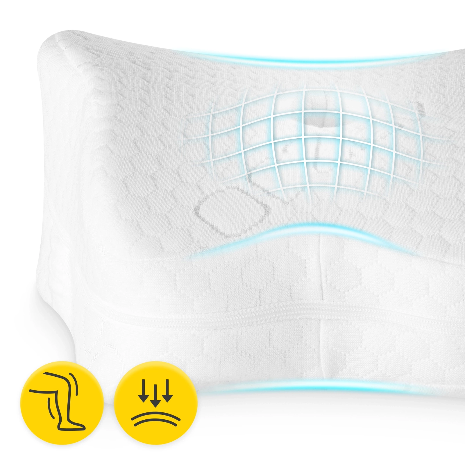 Podczas spania z poduszką ortopedyczną PRO 4FIZJO nogi są utrzymywane w odpowiedniej osi. Dobra pozycja w trakcie snu sprawia, że plecy w odcinku lędźwiowo-krzyżowym są odciążone, co może pomóc redukować dolegliwości bólowe.