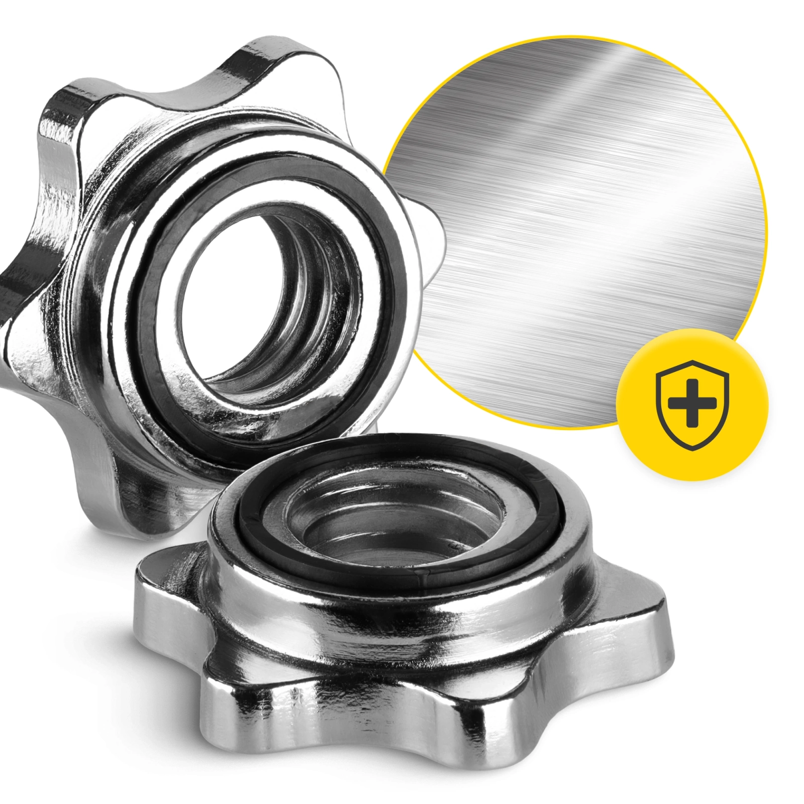 Zadaniem zacisków śrubowych na gryf jest mocne i pewne utrzymanie obciążenia. To właśnie dzięki nim nie musisz się martwić o swoje bezpieczeństwo podczas treningu oraz to, czy talerze będą się przesuwać i obijać się o siebie w trakcie wykonywania serii.
