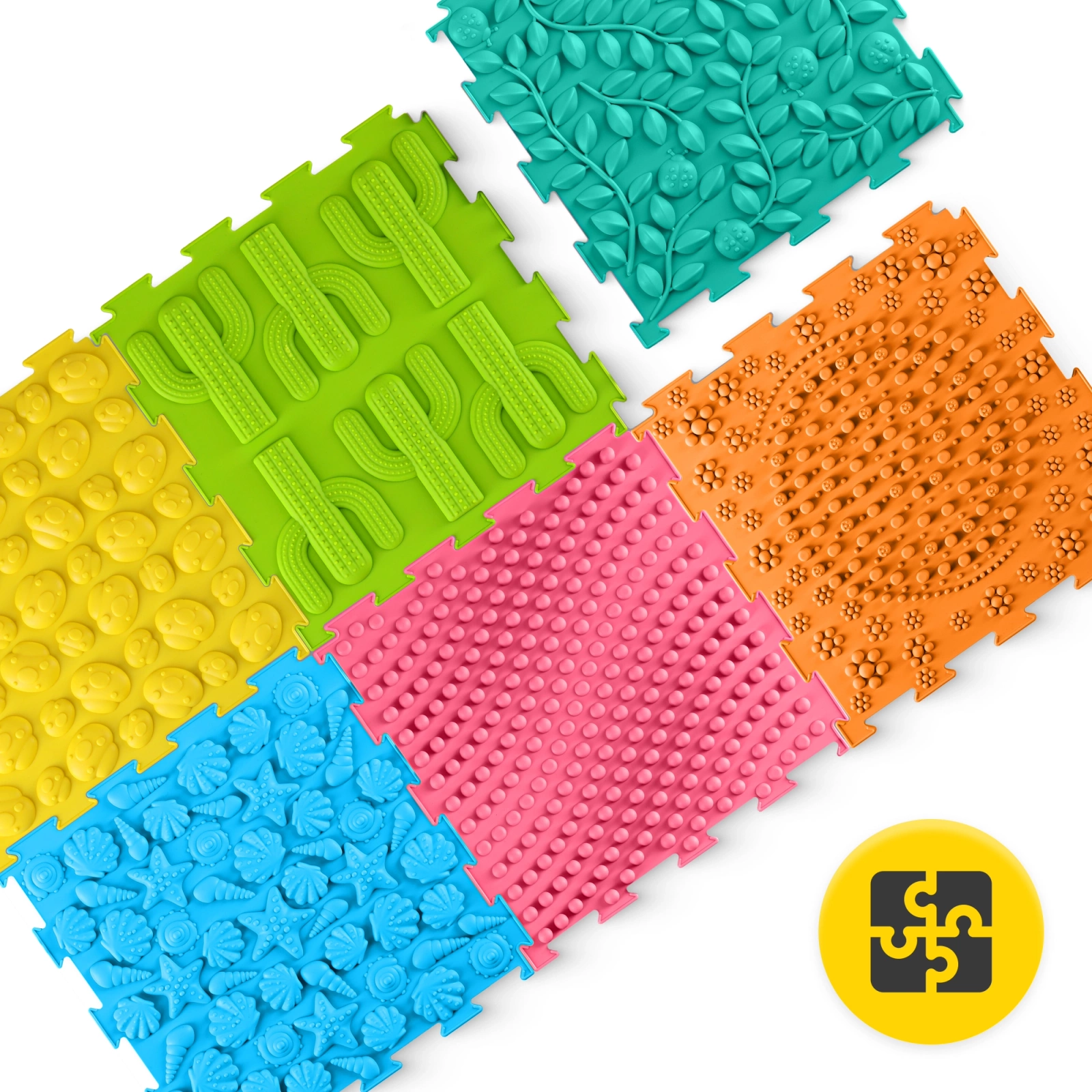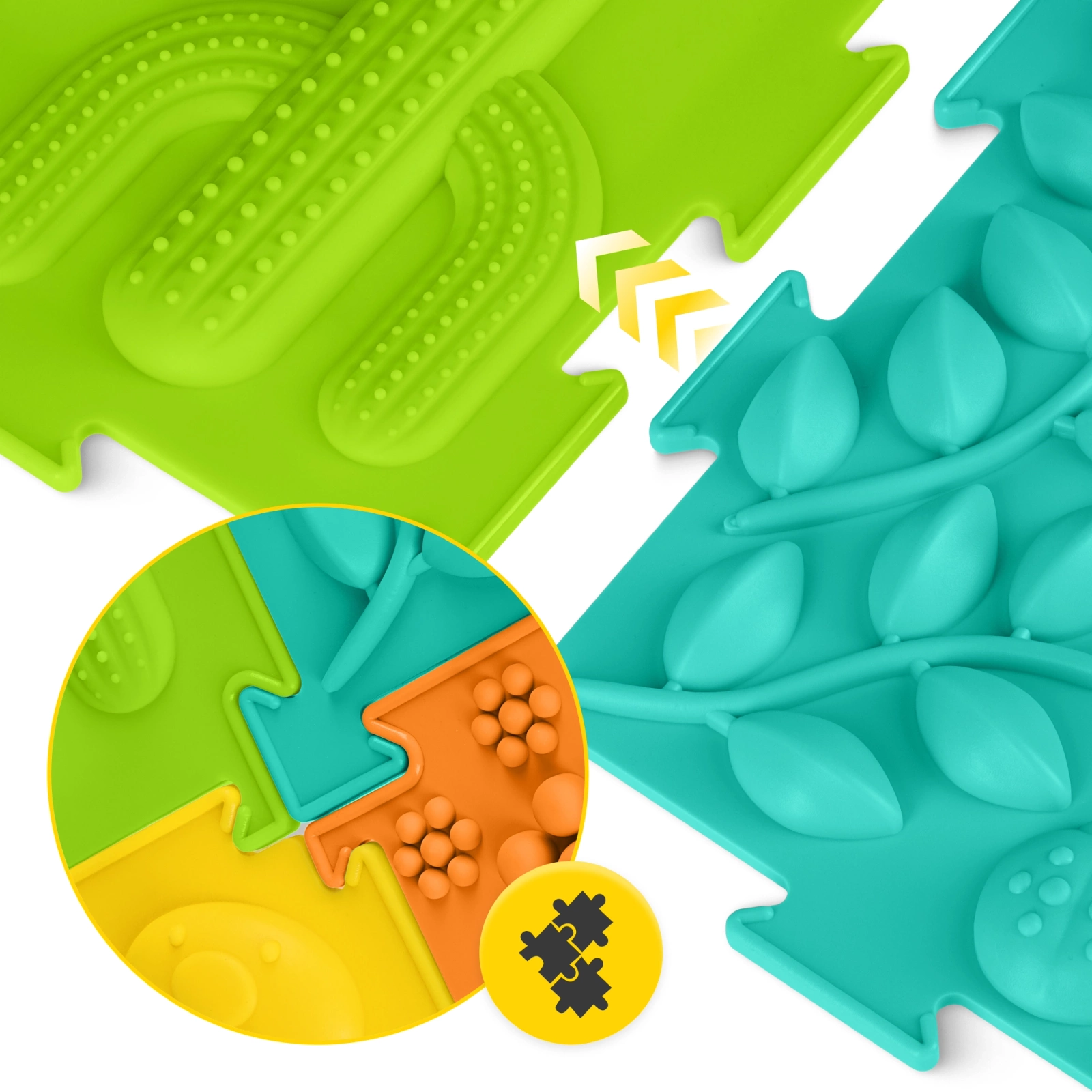 Każdy z sześciu puzzli ma inną powierzchnię. Nie bez powodu – różnorodne faktury to po prostu nowe doświadczenia dla małych stóp! Rozwiązanie to pozwala małemu użytkownikowi poznawać świat przez dotyk. Różnorodne faktury, wypustki i kształty aktywizują receptory w stopach, wspierając tym samym prawidłowy rozwój stopy, układu nerwowego oraz koordynacji ciała.