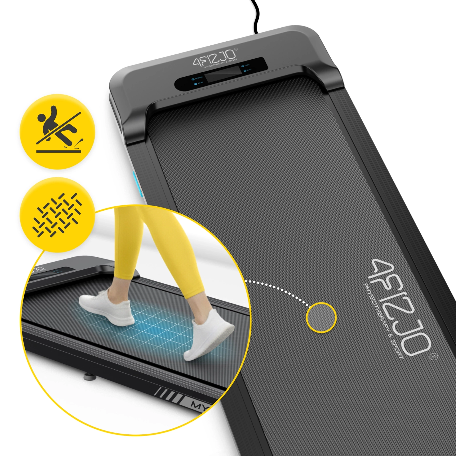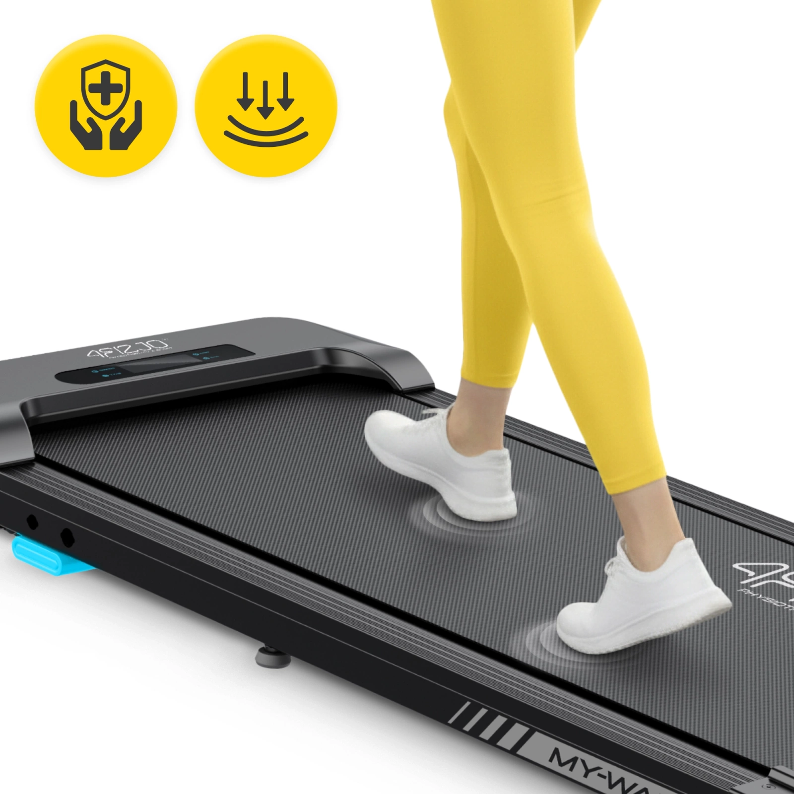 Bieżnia elektryczna domowa walking pad MY-WALK posiada antypoślizgową powierzchnię, która minimalizuje ryzyko upadków i utraty równowagi. Matowa faktura pasa biegowego zapobiega niekontrolowanemu ześlizgiwaniu się z toru biegu. Rozwiązanie to pozwoli Ci wykonywać efektywne treningi bez obaw o kontuzje.