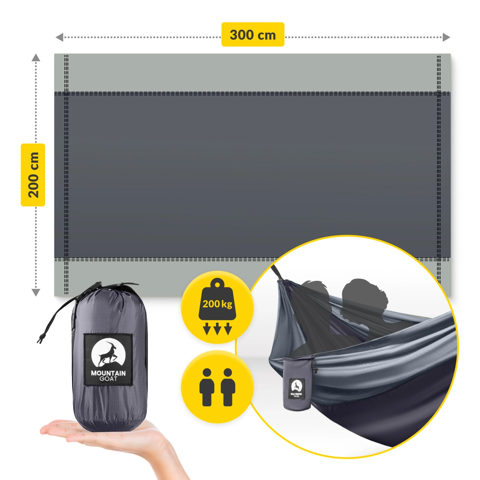Zaletą hamaka są również wysokiej jakości materiały. Do produkcji modelu MOUNTAIN GOAT wykorzystano oddychający i miękki w dotyku nylon spadochronowy 210T. Cechuje się on trwałością i odpornością na wilgoć.