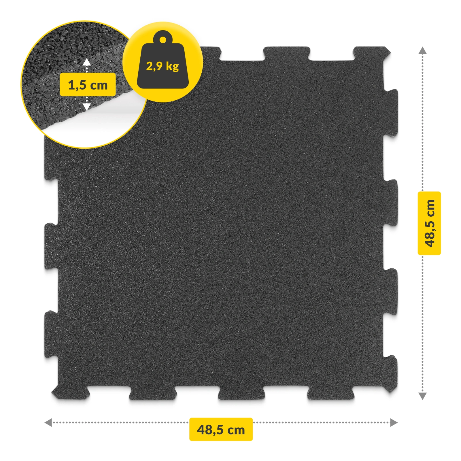 Jesteś w trakcie urządzania swojej własnej domowej siłowni? Szukasz sprawdzonej ochrony podłoża do sali fitness i pod sprzęt crossfitowy? Nasz zestaw, w skład którego wchodzą 4 gumowe puzzle o wymiarach 48,5 x 48,5 x 1,5 cm, przypadnie Ci do gustu! Ochronna mata gumowa idealnie chroni bowiem wszelkiego rodzaju podłogi przed uszkodzeniami mechanicznymi, a ponadto zapewnia komfortową przestrzeń do ćwiczeń. Wybierz zestaw puzzli gumowych 4FIZJO i korzystaj z niego w domu, na salce treningowej albo w wybranym obiekcie sportowym.