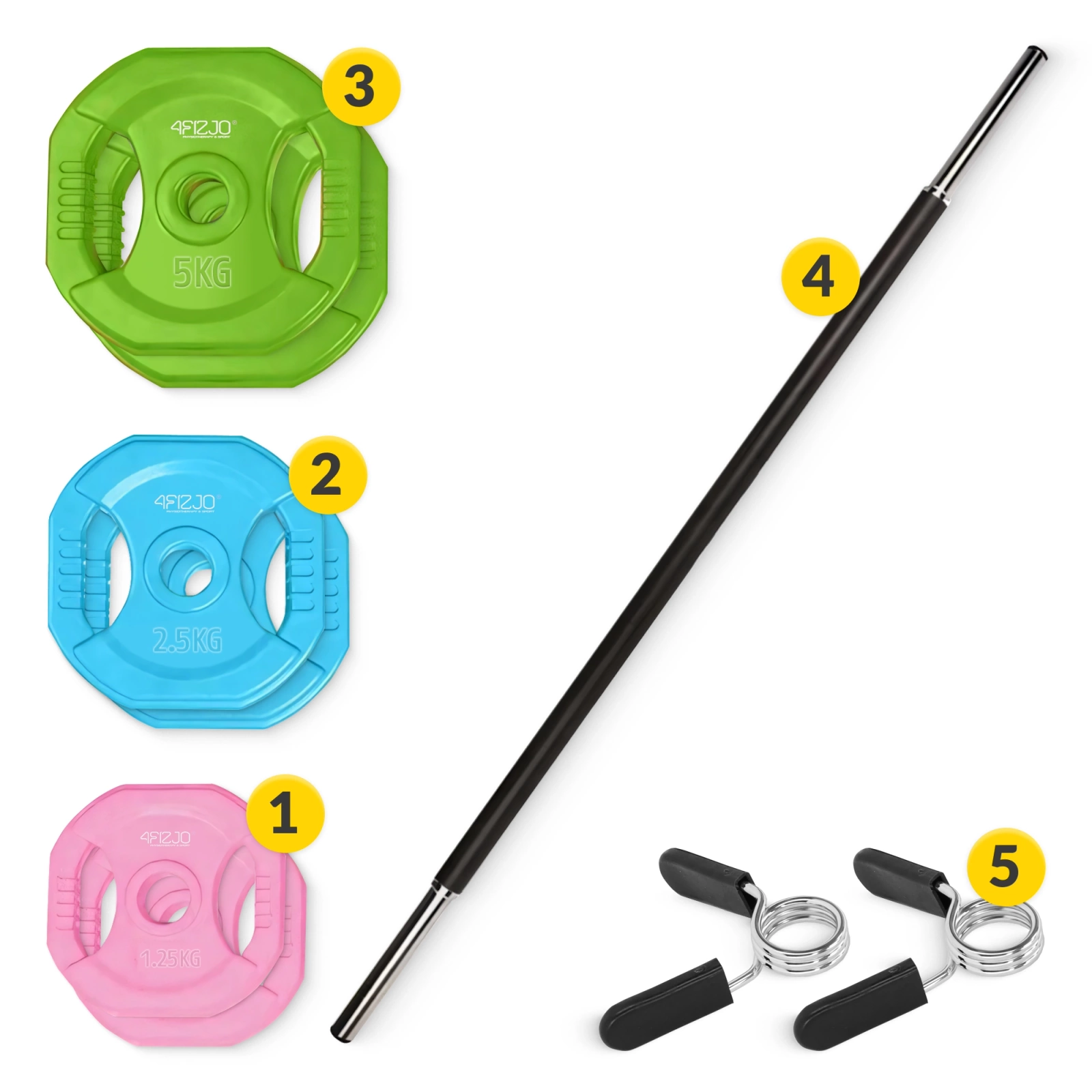 ✔️ Zestaw zawiera: gryf oraz talerze: 2 × 1.25 kg, 2 × 2.5 kg, 2 × 5 kg, 2 x zaciski motylkowe
