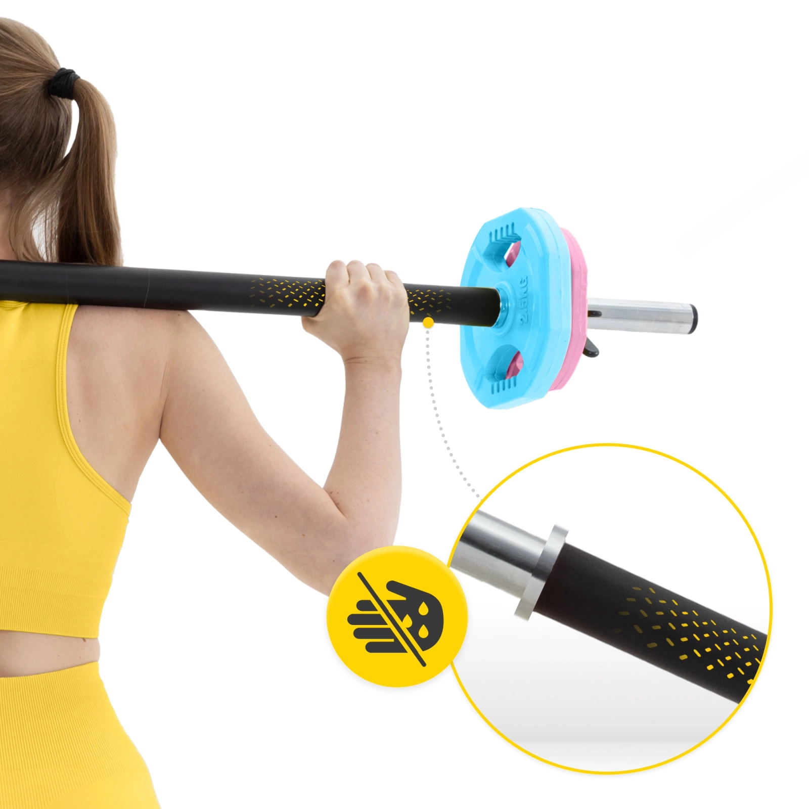 ▶️ Dwa ergonomiczne uchwyty na dłonie – pozwalają szybko i wygodnie zamienić obciążenie na sztandze, a także umożliwiają wykorzystanie talerzy w roli sprzętu do ćwiczeń siłowych bez sztangi.