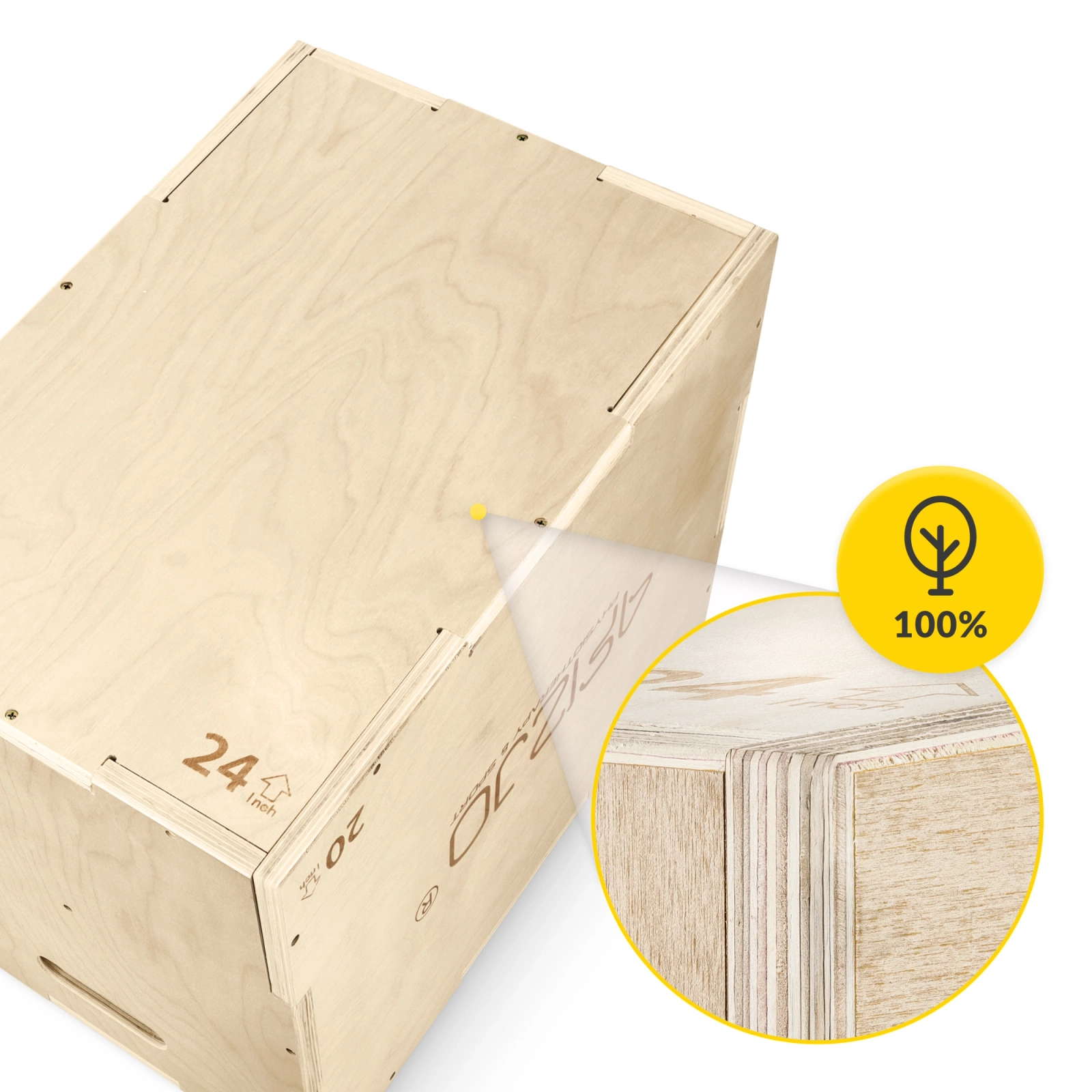 3️⃣ Sklejka o grubości 2 cm – skrzynia wykonana jest ze sklejki z drzew liściastych o grubości aż 2 cm, co zapewnia skrzyni plyometrycznej wytrzymałość aż do 150 kg.