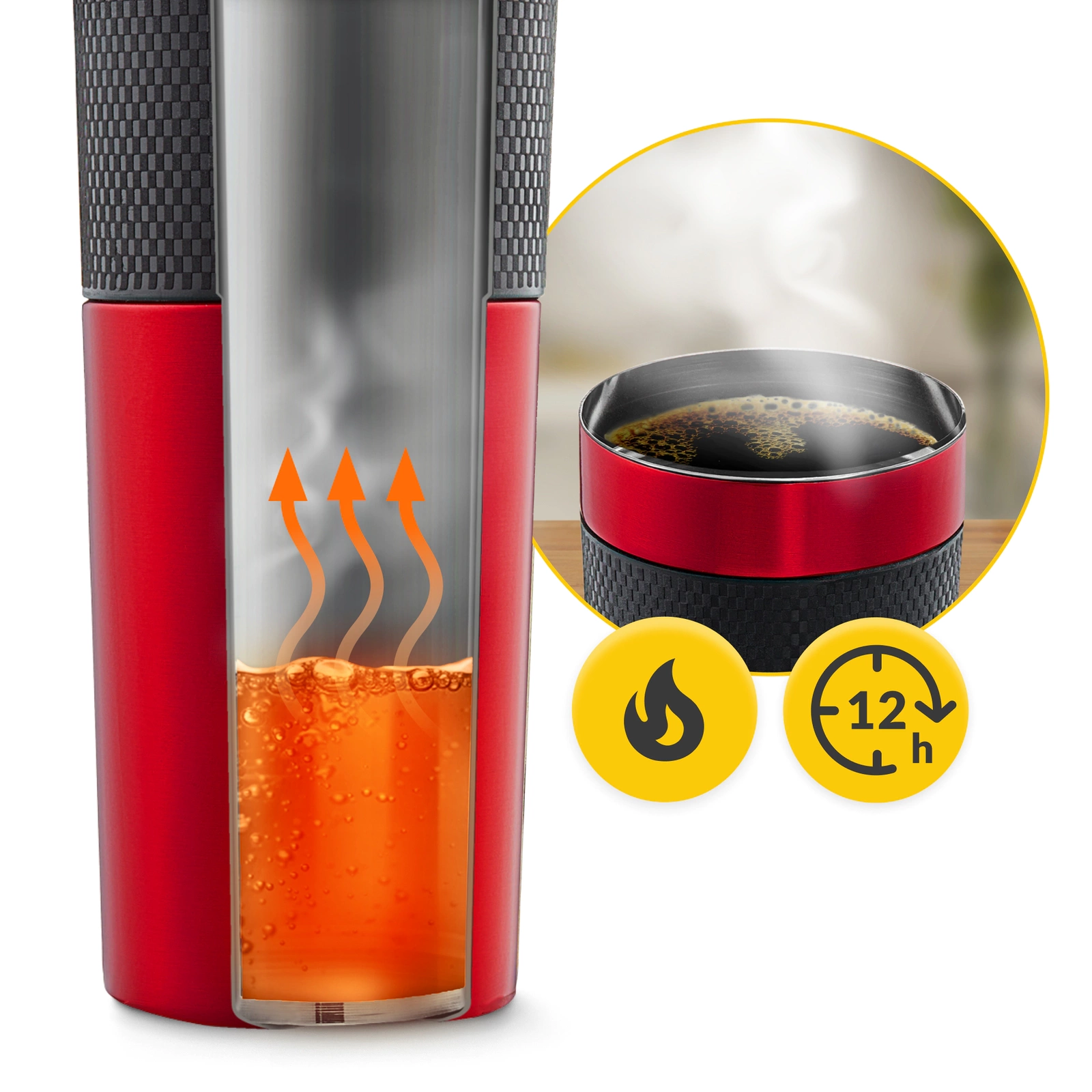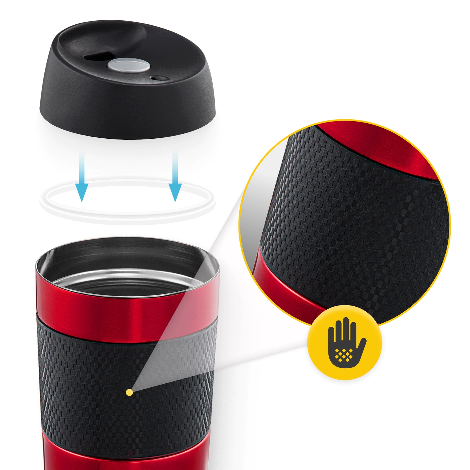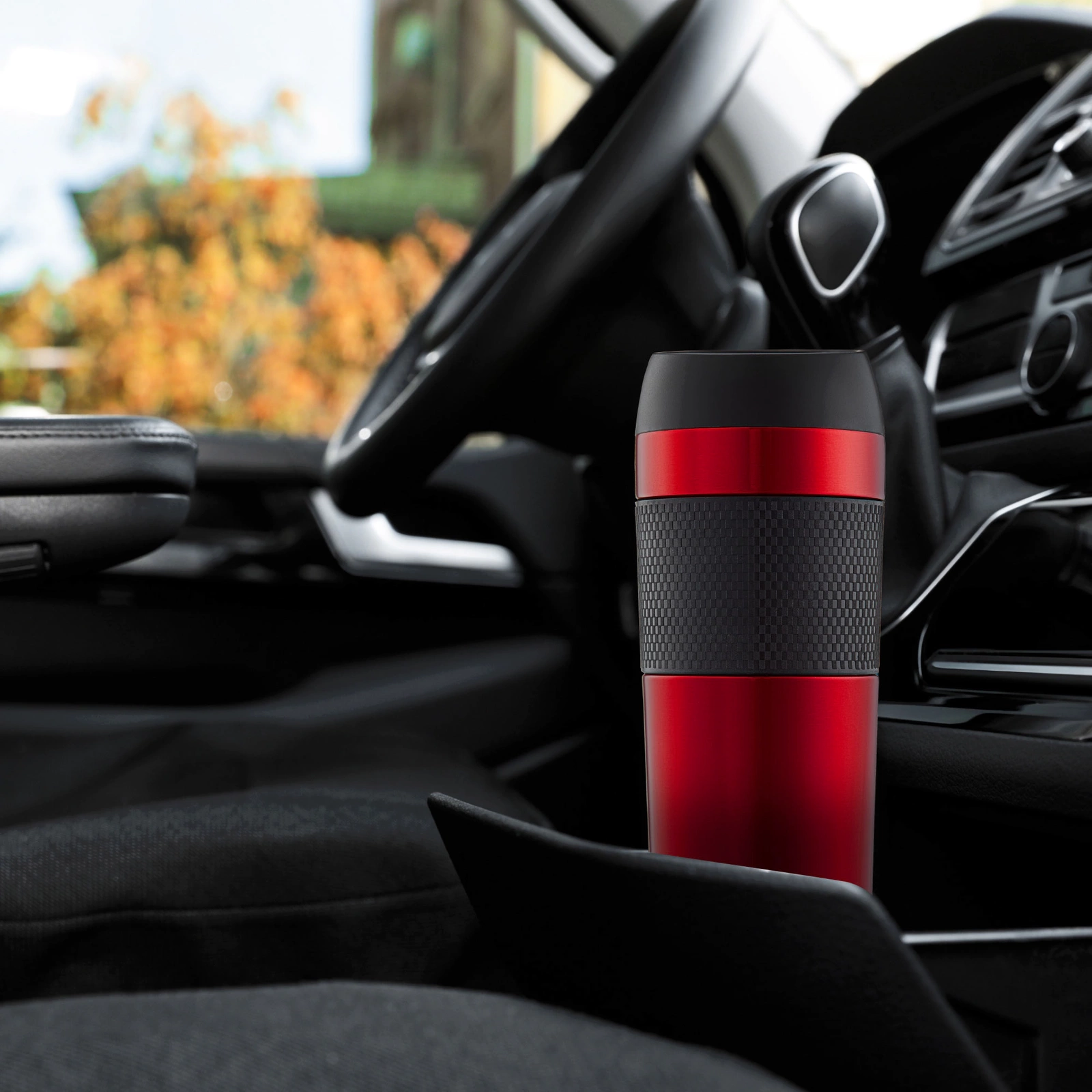 Ergonomiczny kształt kubka termicznego na herbatę i kawę zapewnia wygodne i stabilne trzymanie w dłoni. Antypoślizgowa podstawa uniemożliwia ześlizgiwanie się z powierzchni. Pojemność 450 ml pomieści prawie dwa kubki twojej ulubionej kawy lub herbaty. Co więcej, poręczny rozmiar sprawia, że kubek nie zajmuje wiele miejsca. Bez problemu zmieści się w bocznej przegrodzie drzwi i w uchwytach samochodu.