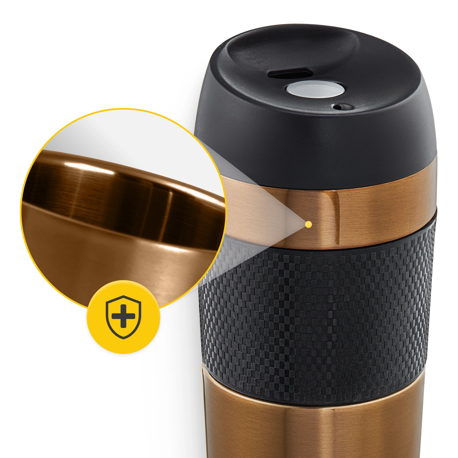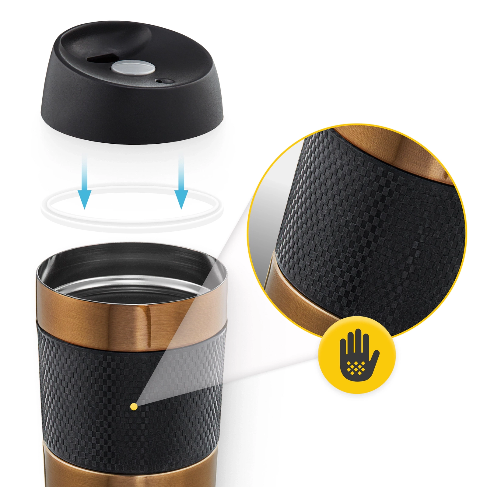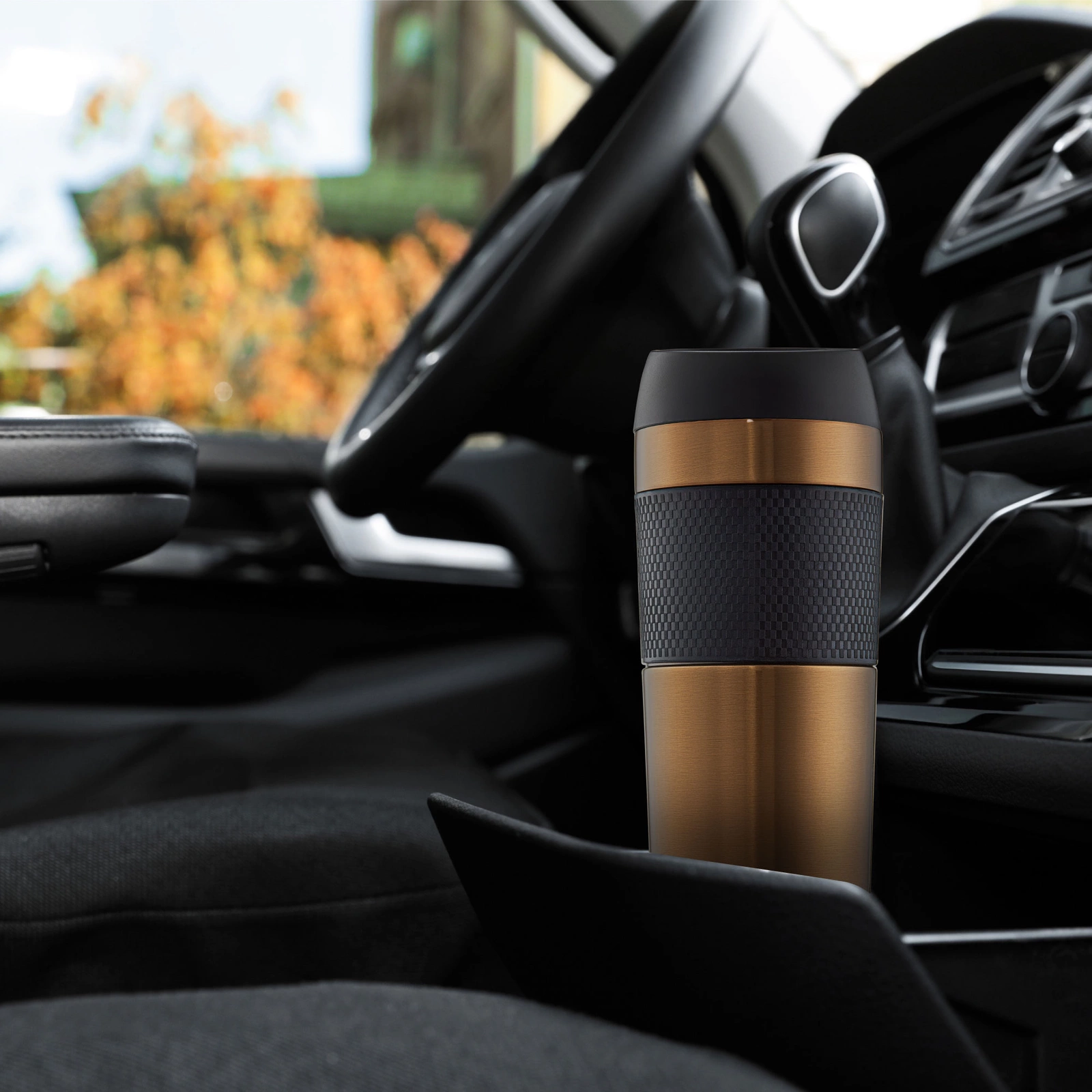 Ergonomiczny kształt kubka termicznego na herbatę i kawę zapewnia wygodne i stabilne trzymanie w dłoni. Antypoślizgowa podstawa uniemożliwia ześlizgiwanie się z powierzchni. Pojemność 450 ml pomieści prawie dwa kubki twojej ulubionej kawy lub herbaty. Co więcej, poręczny rozmiar sprawia, że kubek nie zajmuje wiele miejsca. Bez problemu zmieści się w bocznej przegrodzie drzwi i w uchwytach samochodu.