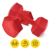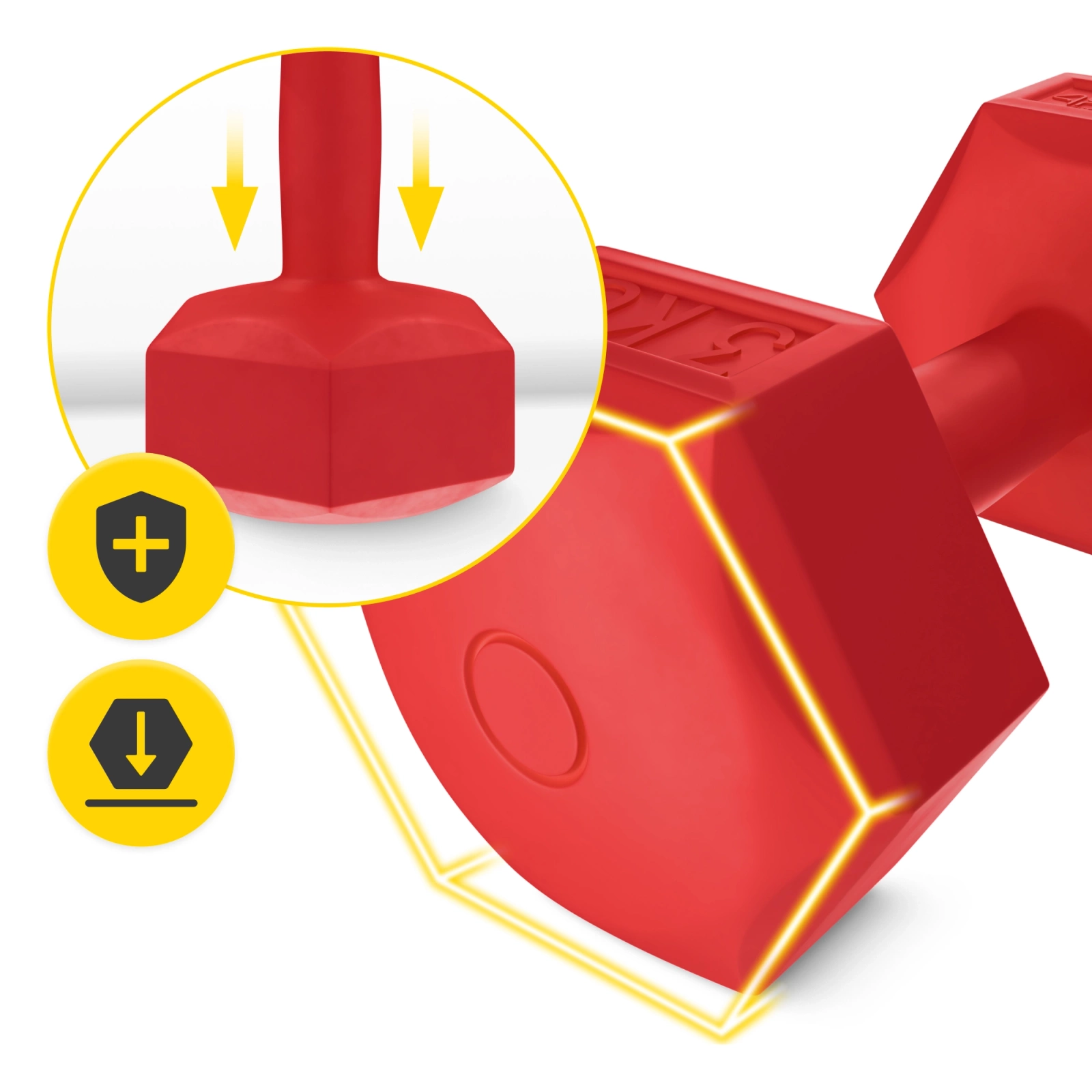 ▶️ Powłoka hantli chroni podłogę przed zarysowaniami, a sześciokątny kształt zapobiega niekontrolowanemu toczeniu się sprzętu po podłodze, co zwiększa bezpieczeństwo podczas treningu.
