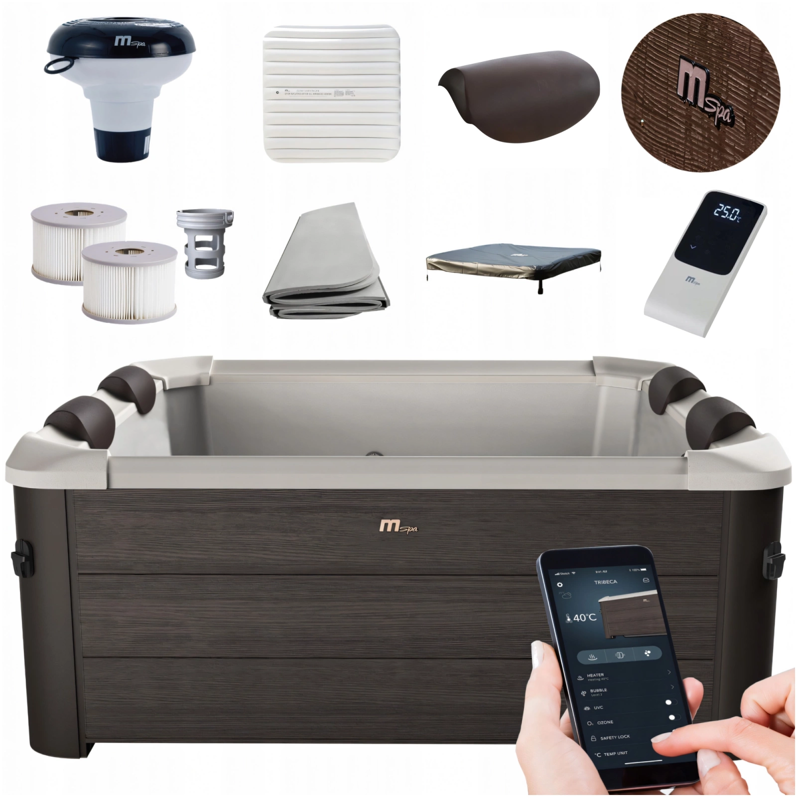 Wspólne wieczory pod gołym niebem? Tylko z ogrodowym spa TRIBECA. To prawdziwa perełka wśród panelowych wanien z hydromasażem. 6-osobowe spa całoroczne zapewni relaks i regenerację zarówno Tobie, jak i twoim najbliższym – i to niezależnie od warunków pogodowych. Dzięki solidnemu wykonaniu i najwyższej estetyce model ten doskonale wpasuje się do każdego ogrodu, nadając mu wyjątkowego charakteru. MSpa TRIBECA zachwyca zarówno eleganckim wykończeniem przypominającym ciemny orzech, jak i funkcjonalnością. Aby zapewnić najwyższy komfort, dołączono zagłówki.