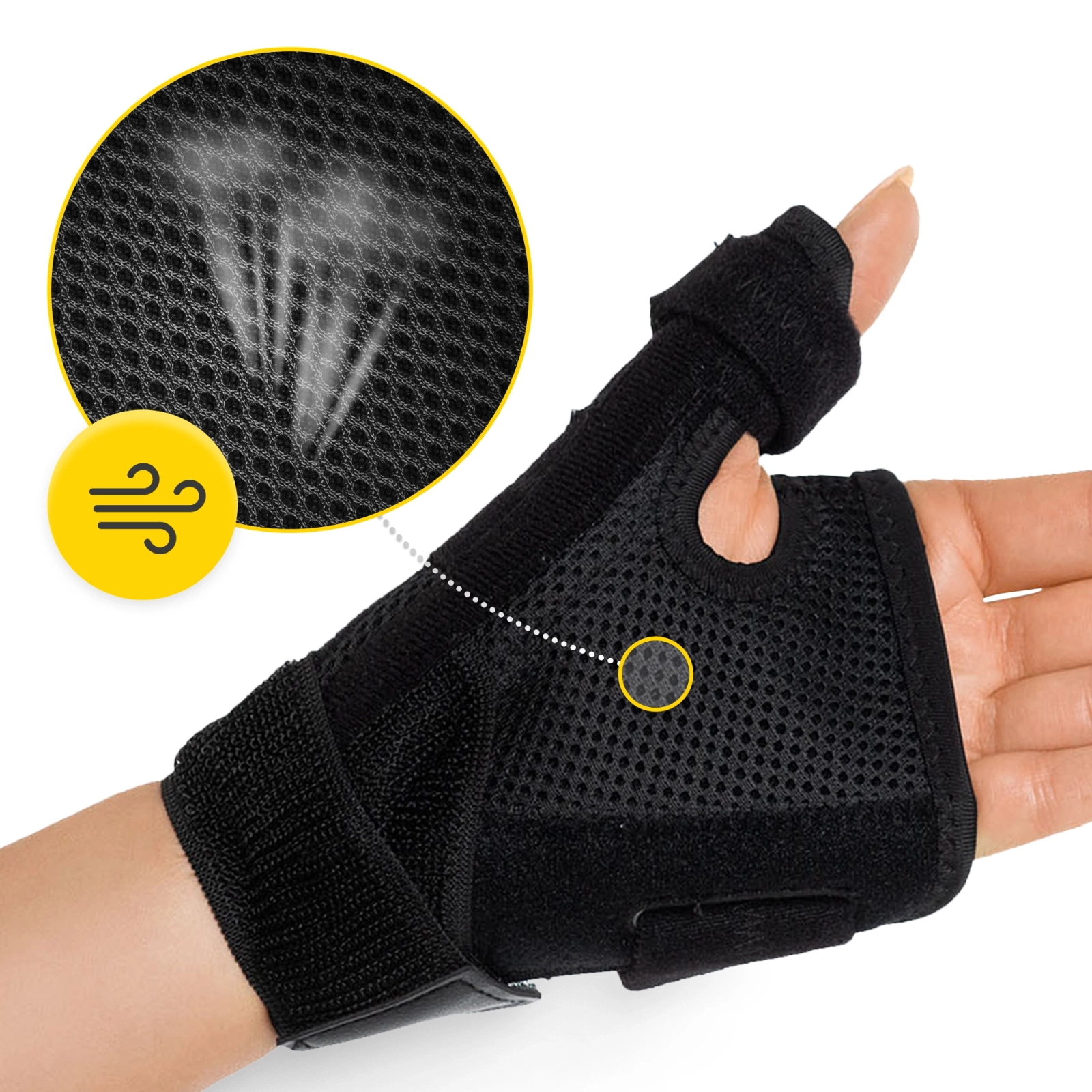 Komfort użytkowania ortezy na nadgarstek i kciuk jest priorytetem w dążeniu do szybkiej poprawy stanu zdrowia dłoni. Dlatego też, aby go zapewnić, stabilizator wykonano ze specjalnego i przyjemnego w dotyku materiału Airmesh. Jest to niezwykle miękka, delikatnie usztywniona i ekologiczna tkanina. Jej właściwości sprawiają, że z łatwością przepuszcza powietrze, gwarantując zarówno komfort termiczny, jak i lekkość noszenia.